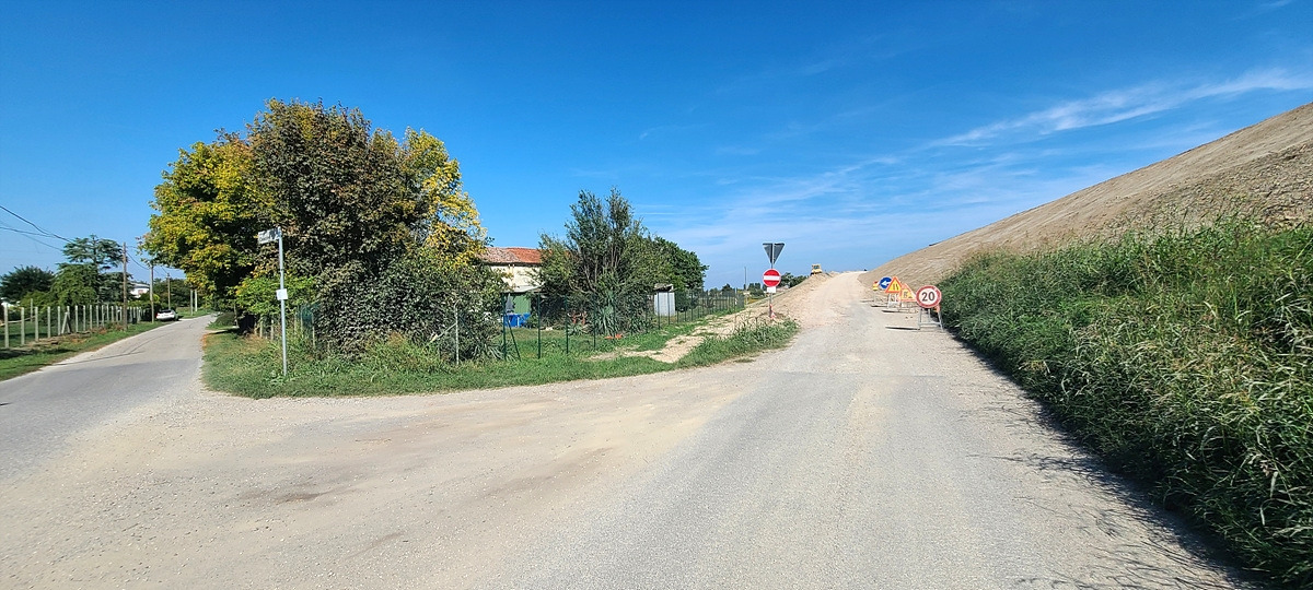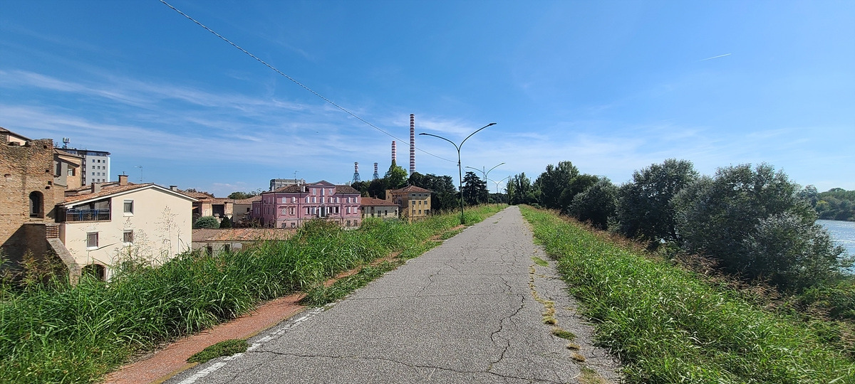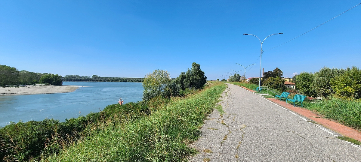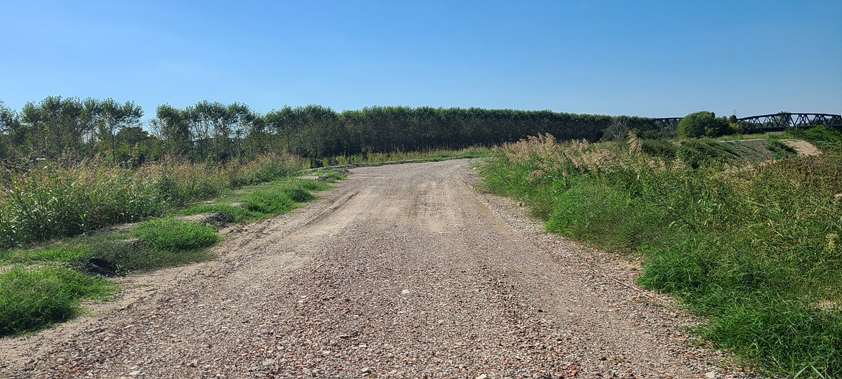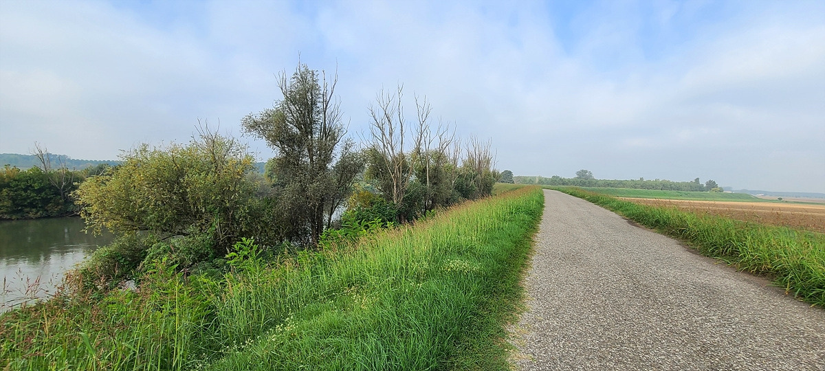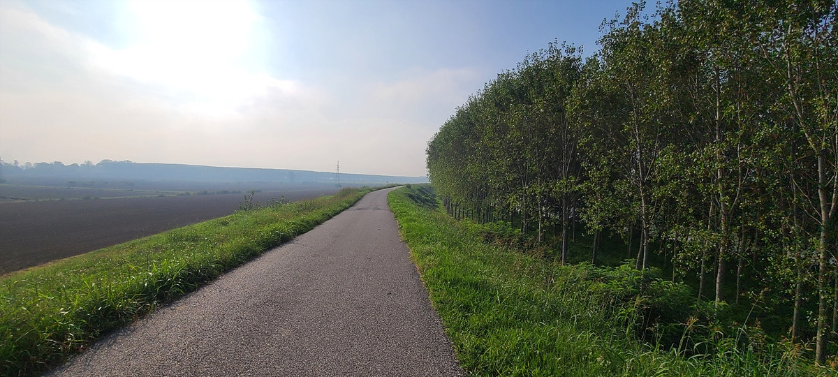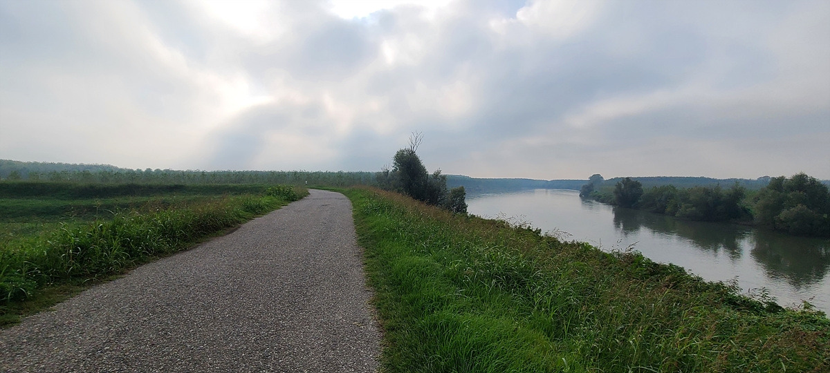강가로 가보니 바로 옆 뚝방길에 자전거가 많이 다니는 도로가 있다. 이 길을 타기 위해 이렇게나 남쪽으로 내려왔다. 길은 좁고, 차도 거의 다니지 않는다. 자전거 표시가 그려진 표지판을 보니 유로벨로 8코스인 듯 하다. 그리고 유로벨로답게 노면이 아주 별로다. 다 낡아빠지고 벗겨져서 표면이 아주 거친 이 아스팔트를 포장도로라고 불러야 할지 모르겠다. 하지만 차가 아주 적다는 사실로 위안을 삼는다.