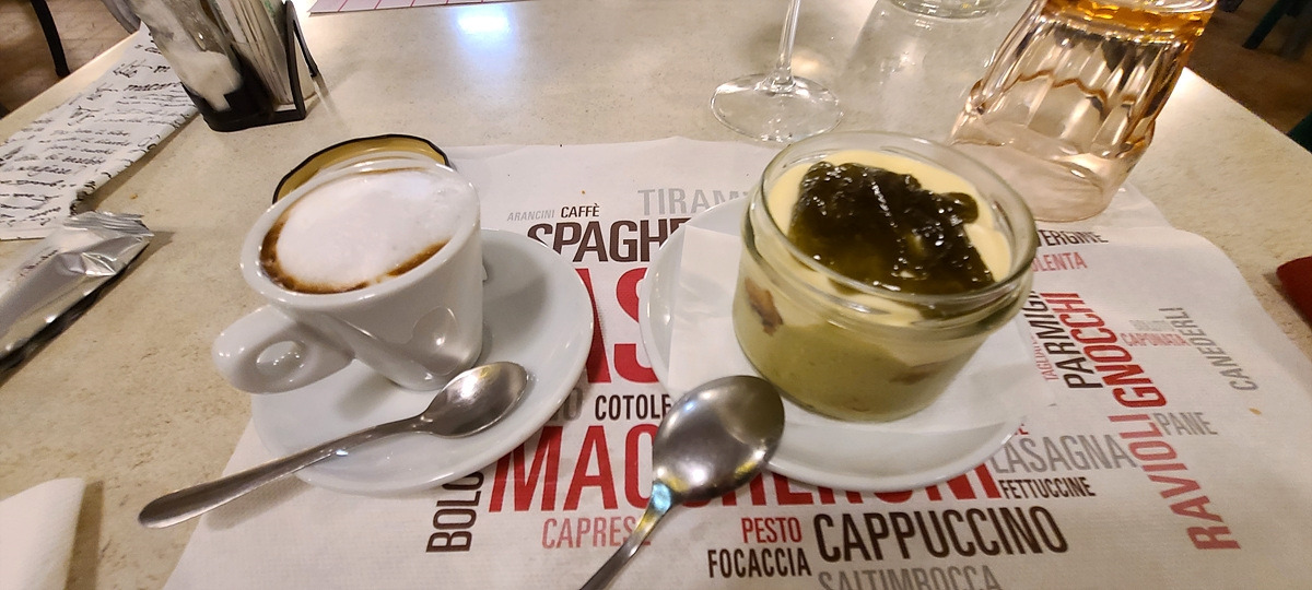 나의 철칙, 맛난 곳은 디저트를 주문한다! 웨이트리스에게 물어보니 설명이 어려운지 같이 안으로 들어가서 디저트 진열장을 보자고 한다. 피스타치오 티라미슈와 라떼마끼야 주세요~ 음, 굿. 야미!