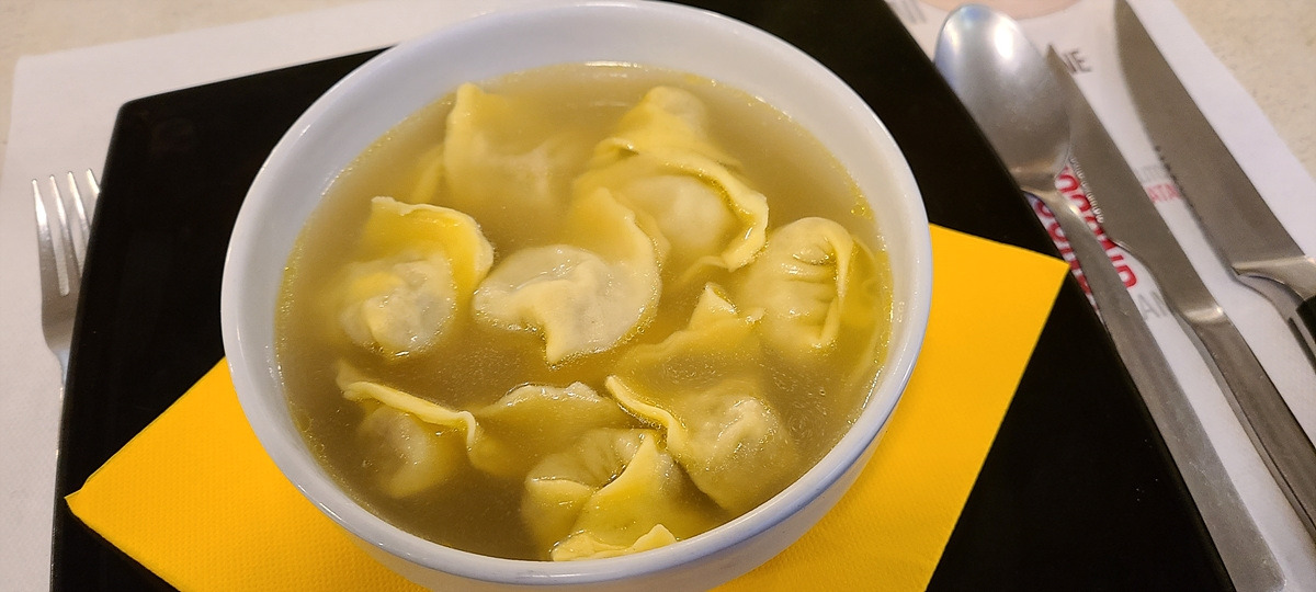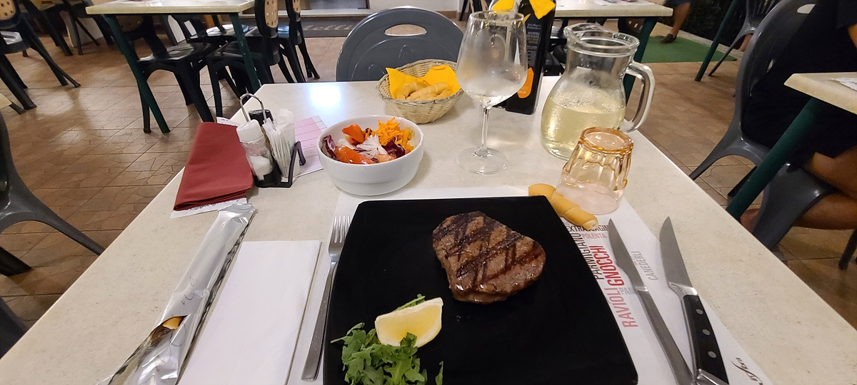 아까 준 와인 한잔이 맛있어서 찾아보니 이 지방에서 유명한 프로세코라는 스파클링 화이트 와인이다. 달지 않아서 더 내 맘에 든듯? 와인 1리터와 카펠리티로 만든 숩, 그리고 스테이크를 시켰다. 와인은 아까만큼 맛있고, 숩은 완전 만두국이다. 완전 조아!!