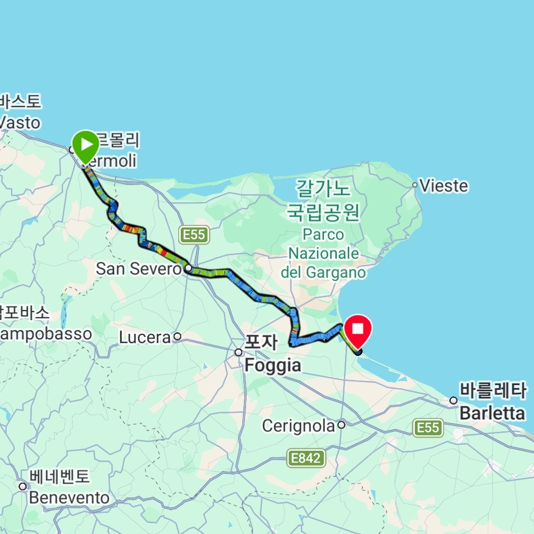 산세베로(Sansevero)로 달리는 길에 계속 고민했다. 포자(Foggia)로 들어갈지, 좀 더 달려서 해안으로 나갈지.. 이탈리아에서 손꼽히는 관광지인 갈가노 국립공원의 일일 버스투어를 포자에서 갈 수 있지 않으려나? 하는 기대감에 간만에 큰 도시로 들어갈까 고민을 했지만 나는 역시 한적한 곳이 좋으니 복잡한 포자를 거치지 않고 해안으로 질러가는 길을 택했다. 나중에라도 갈가노 투어를 가려고 따로 알아봤는데, 그곳은 매우 큰 규모를 자랑하는 곳이라 렌터카로도 1주일 정도 둘러봐야 하는 대단한 곳이었다. 그래서 갈가노는 이번 여행에서 포기하기로 했다. 이탈리아에 다시 와야만 하는 이유가 생겼다.