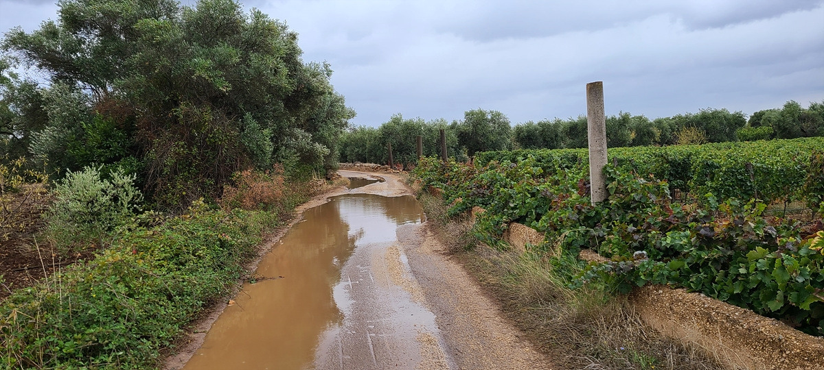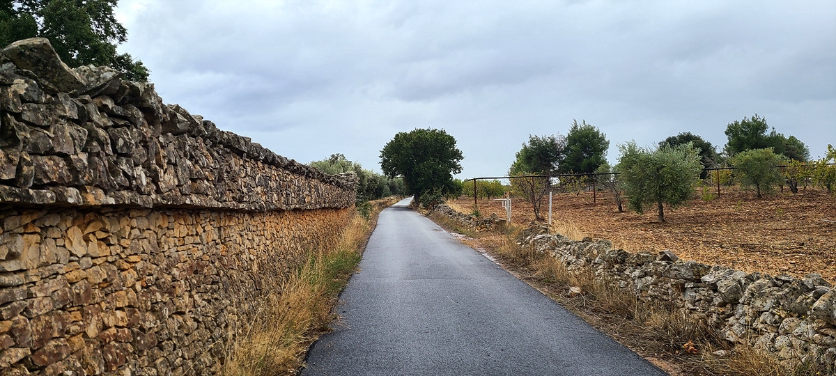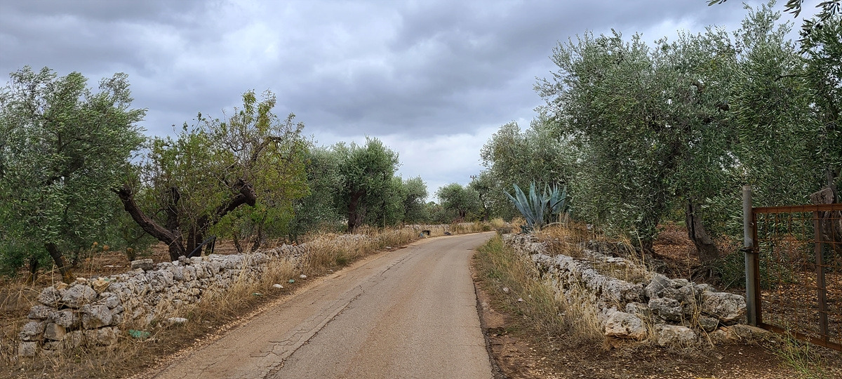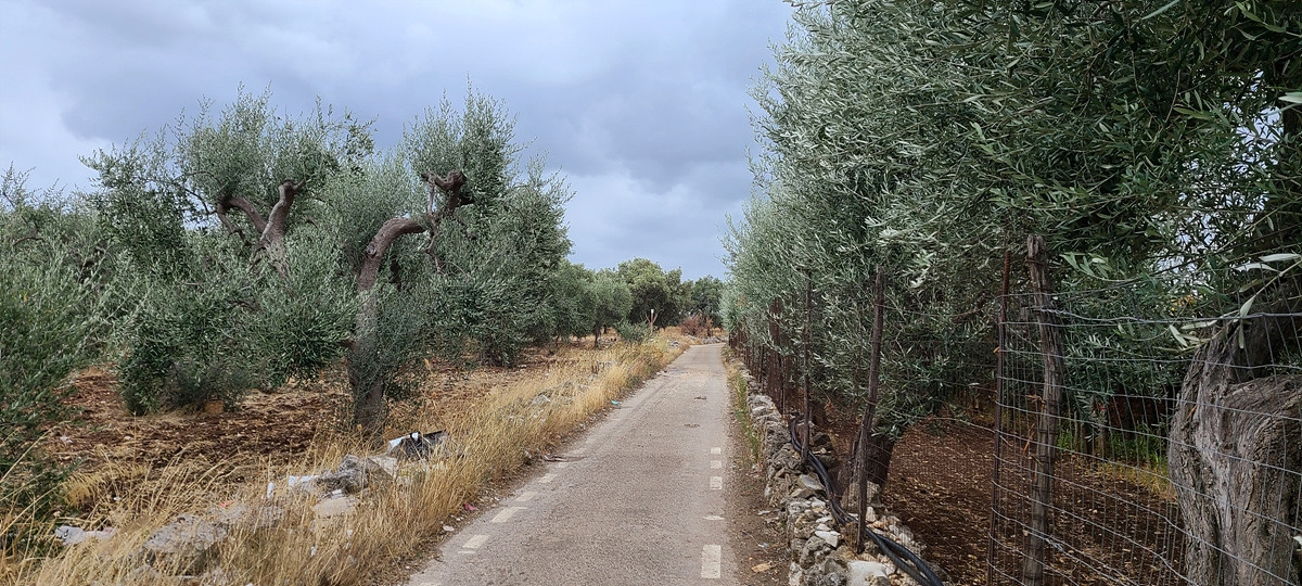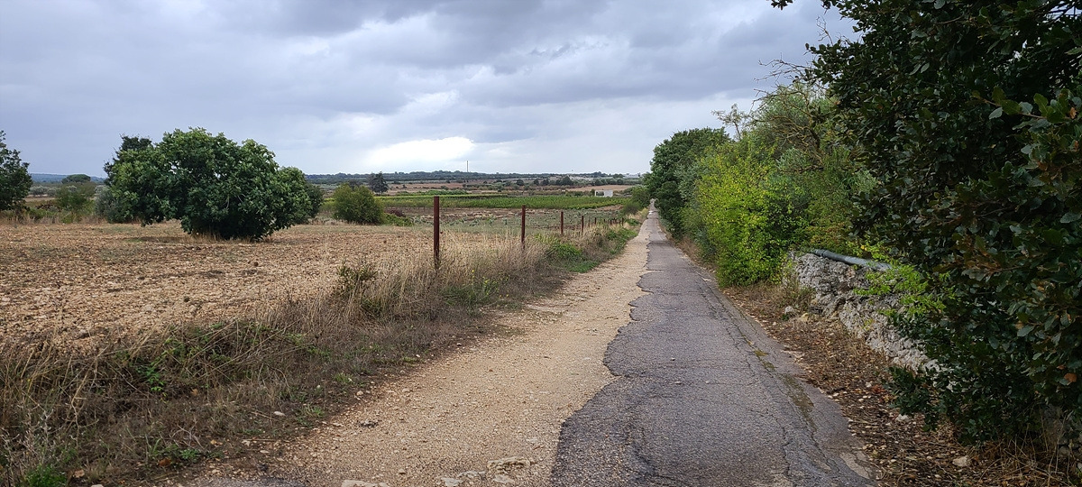 오늘은 원래 쉬려던 것을 가는 날이니까 거리를 아주 조금만 갈 예정이다. 게다가 바람이 세서 해안보다는 내륙에 있는 편이 나을 것 같다. 다시 출발하려니 비가 살살 온다. 오늘 원래 비 소식이 있기는 했지만 막상 빗방울이 떨어지니 기분이 좀 그렇다. 다행히 비는 조금씩만 내렸다가 말았다가 한다. 이제부터는 샛길로 간다. 도로가 엊그제처럼 엉망일까 봐 걱정했는데 생각보다 괜찮다. 사방에 포도밭과 올리브 나부가 그득한 게 농사를 위해 사용하는 아주 작은 도로인 듯했다.
