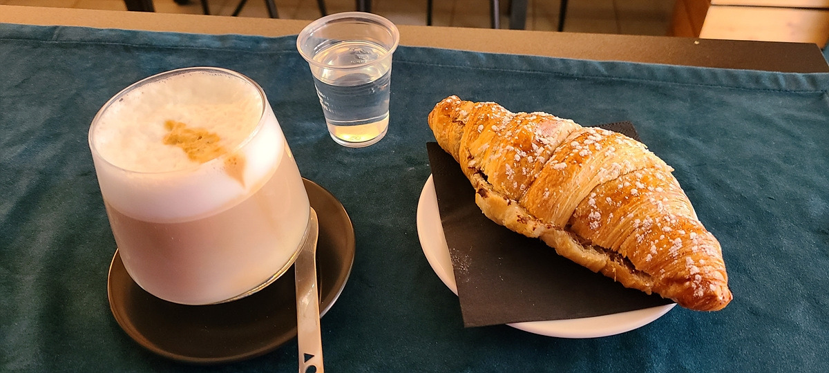 다음 마을에서 아침을 먹기 위해 카페를 찾는데, 춥고 흐린 날씨 때문에 테라스 좌석을 다 치워놔서 썩 마음에 드는 곳이 없다. 겨우 한 군데에 들어가서 누텔라를 바른 크로아상과 라떼마끼야또를 주문했다.