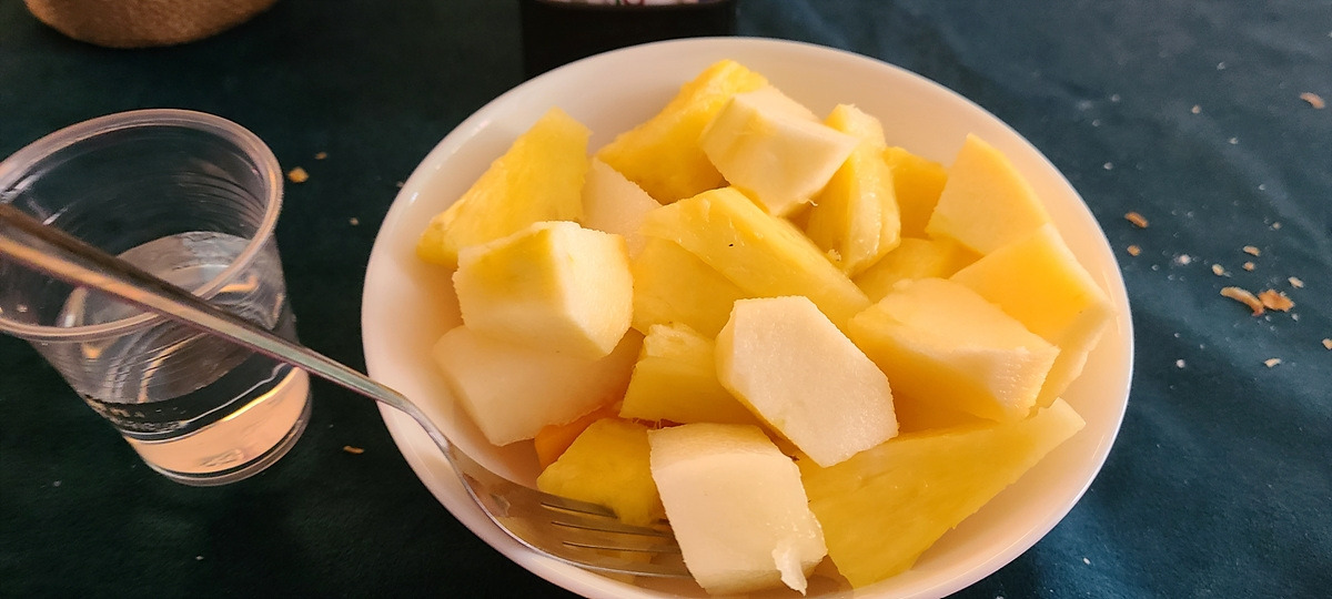 먹는 와중에 가게로 과일 상자가 잔뜩 들어온다. 메뉴를 다시 보니 과일 관련 된 것이 많아서 3유로짜리 모듬 과일을 주문해 봤다. 하얀 멜론, 노란 멜론, 사과, 파인애플, 배 등 풍성하게 나와서 아주 잘 먹었다.