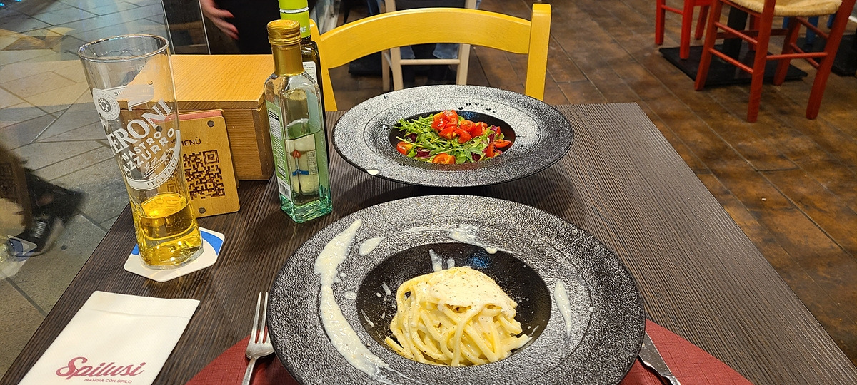 예쁜 골목을 따라 이리저리 걷다가 트립어드바이저에서 봐둔 식당으로 저녁을 먹으러 갔다. 이곳의 생맥주는 아주 시원했고, 안티파스티는 먹고 싶은 모든 메뉴가 조금씩 다 나와서 아주 만족스러웠다. 직원이 통치즈를 내 앞에 가져와서 즉석으로 만들어준 치즈휠 파스타, 카치오에페페(Cacio e Pepe)도 풍미가 그득했다. 손님들이 사진/영상을 찍어주는 것이 익숙한지, 아저씨는 재미있는 퍼포먼스를 멈추지 않았다. 이 식당의 따뜻한 친절함 덕분에 돌체도 주문했다. 여기엔 판나코타가 있으니까...