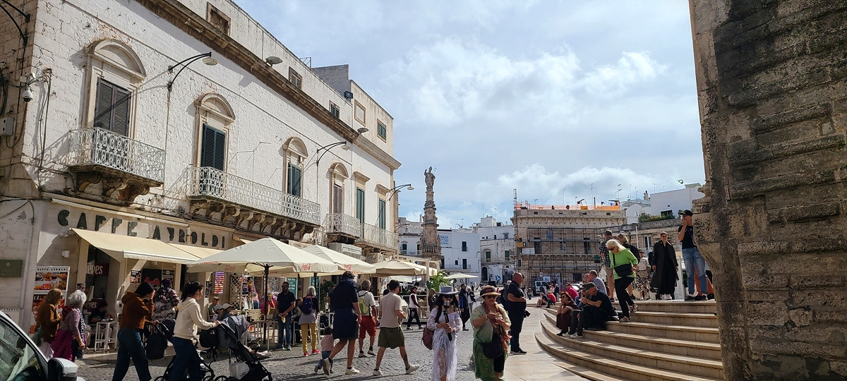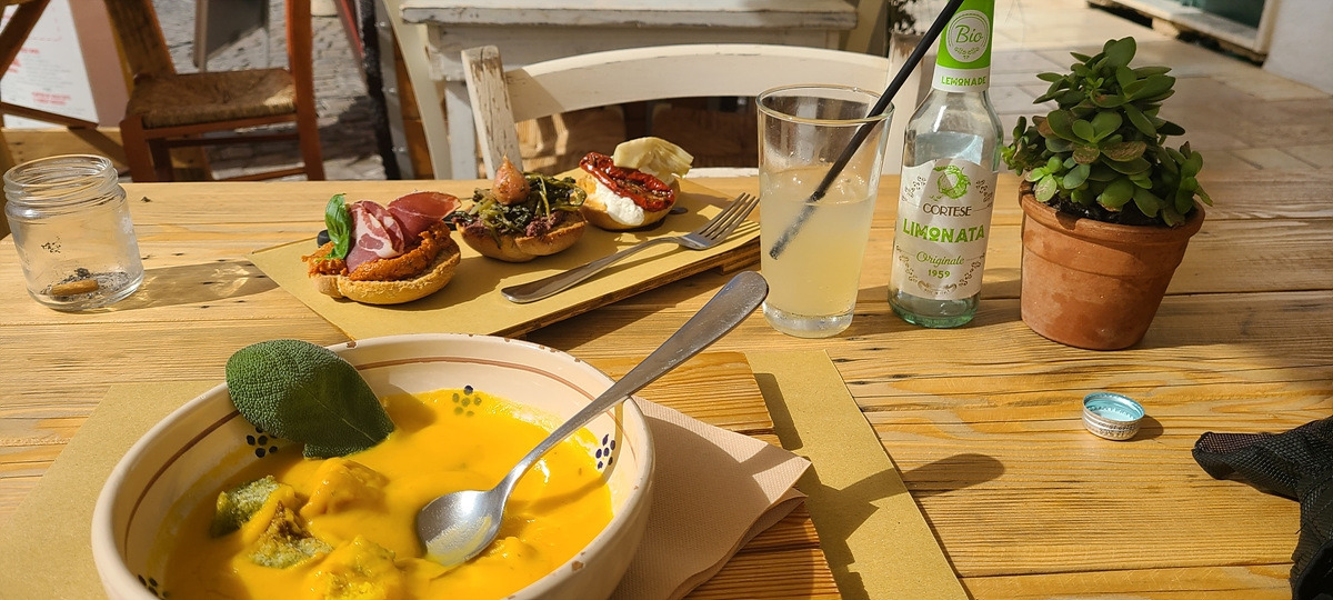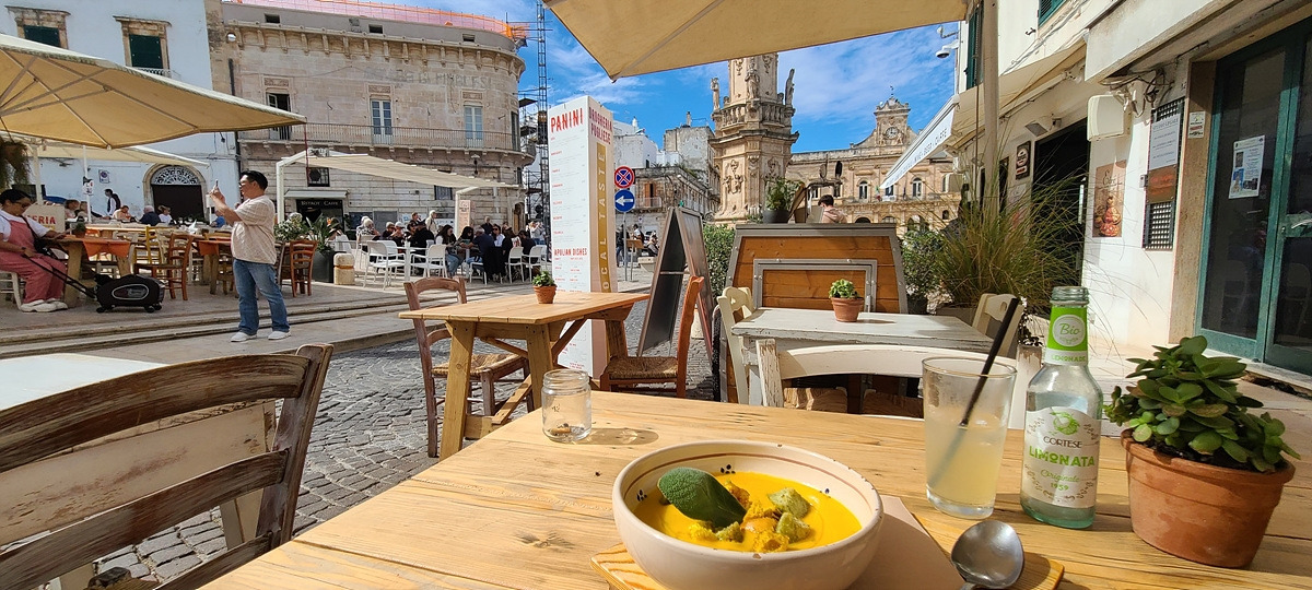 오스투니 마을 입구부터 관광버스와 렌트카가 잔뜩 있더니 사람들이 이곳 중심가 광장에 다 모여있는 것 같다. 뭔가 느낌이 오는 풀리아식 식당의 테라스에 앉았다. 풀리아에서 유명하다는 홍합밥을 골랐는데 제철이 지나서 지금은 안 된다고 했다. 그거 먹으려고 간 건데... 다른 건 거의 빵 종류라 타파스와 오늘의 수프를 주문했다. 단호박수프는 짠단의 균형이 아주 예술이었는데, 타파스는 빵이 너무 딱딱한 게 나와버려서 먹기 힘들었다. 위에 내용물만 긁어먹으니 짜고.. 차라리 문어버거를 먹을 걸 그랬나. 치아 교정을 하고 있으니 딱딱한 식감을 피하기 위한 음식을 선택하기가 어렵다. 이렇게 식당이 많은데 좀 아쉽다.
