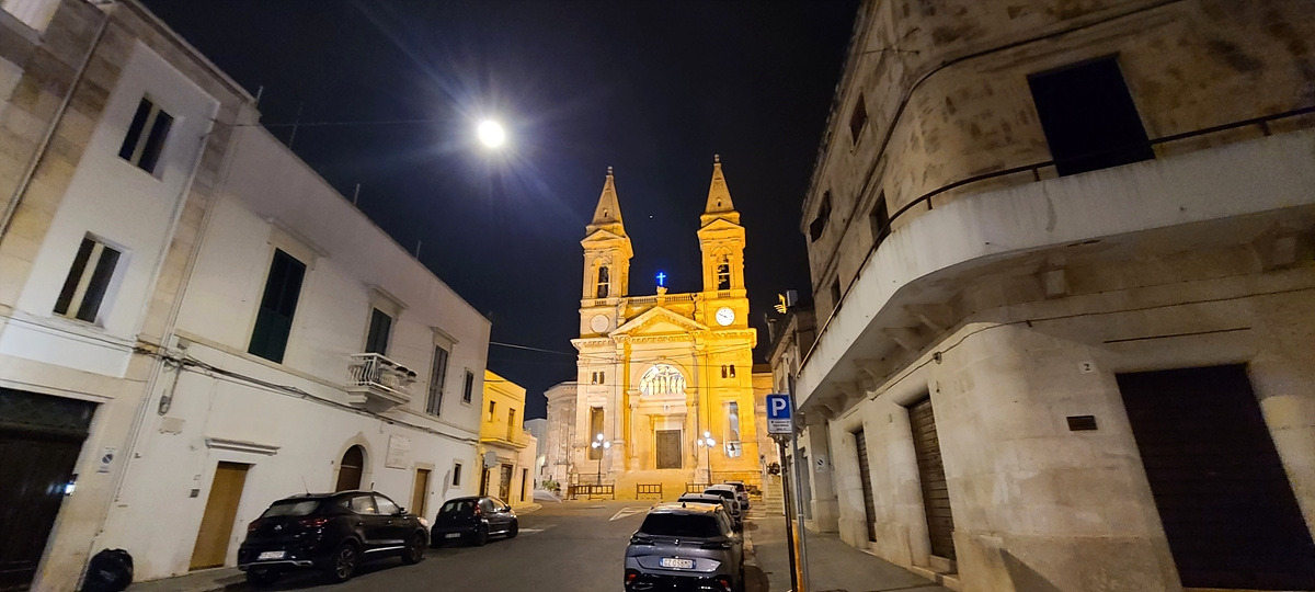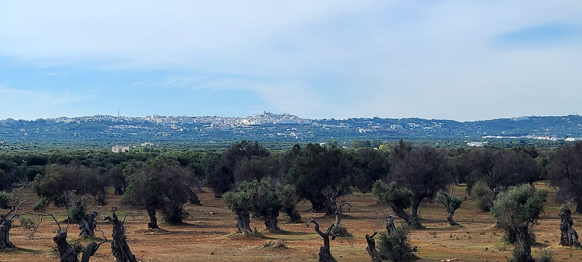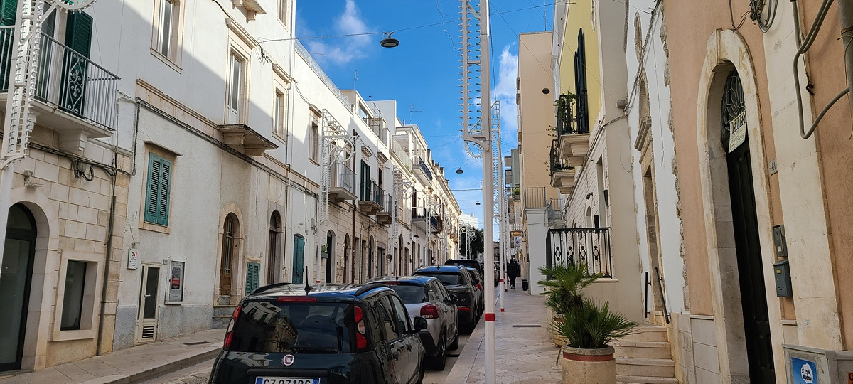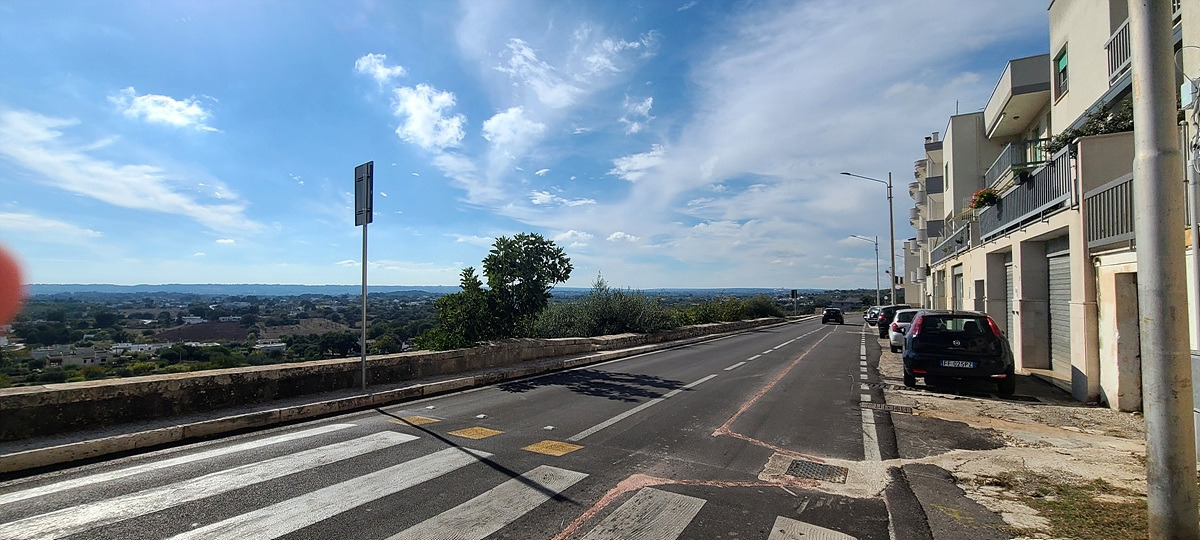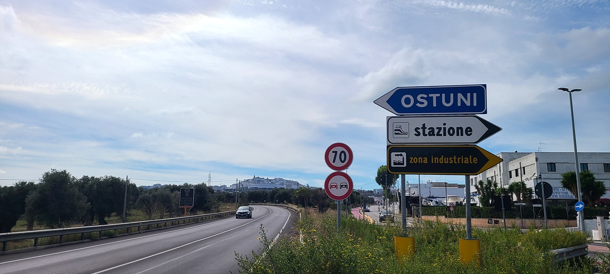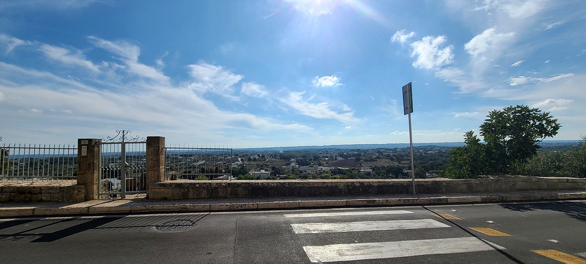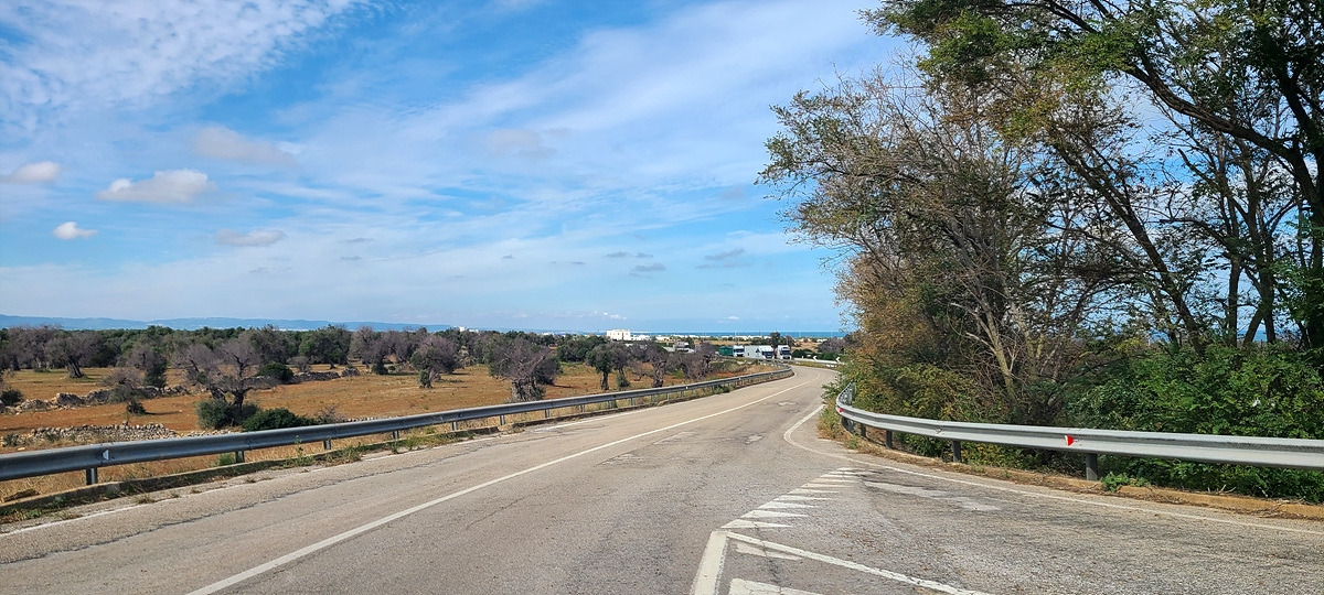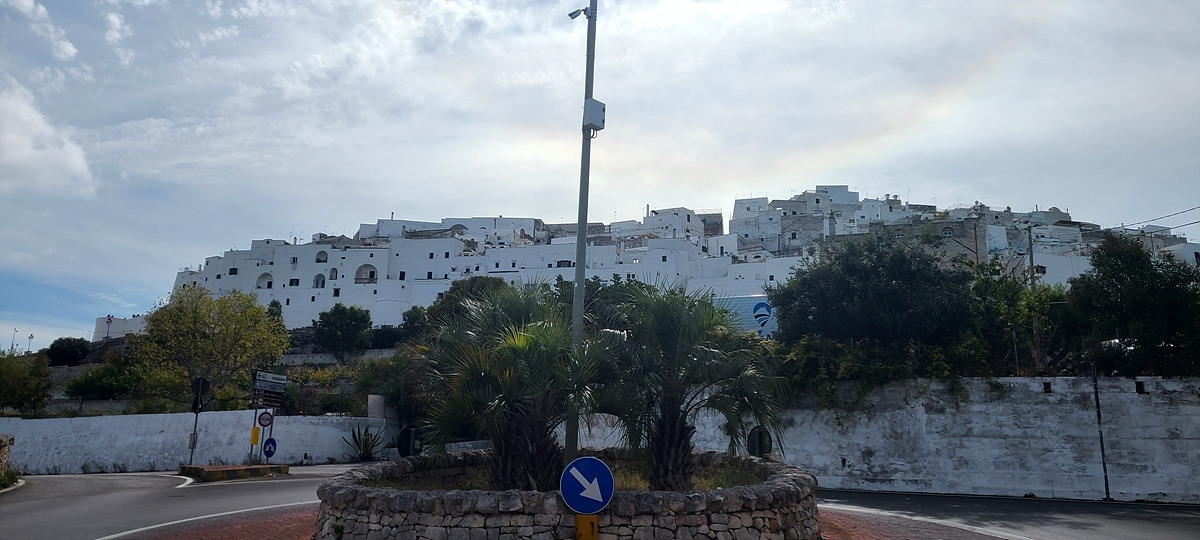 저 멀리 하얀색이 가득한 오스투니(Ostuni)가 보인다. 언덕이다.. 쉬거나 보급하러 동네를 들르려면 도로에서 벗어나 마을로 일부러 들어가야 하는데, 거리를 단축하기 위해 계속 달렸더니 그 부실한 아침을 먹고 50km나 달렸다. 저 하얀 건물들은 문화재 쯤으로 생각해서 가지 않아도 될 것이라 생각했는데, 마을 중심가의 광장이 그곳에 있어서 결국 올라가게 됐다. 아 배고파...