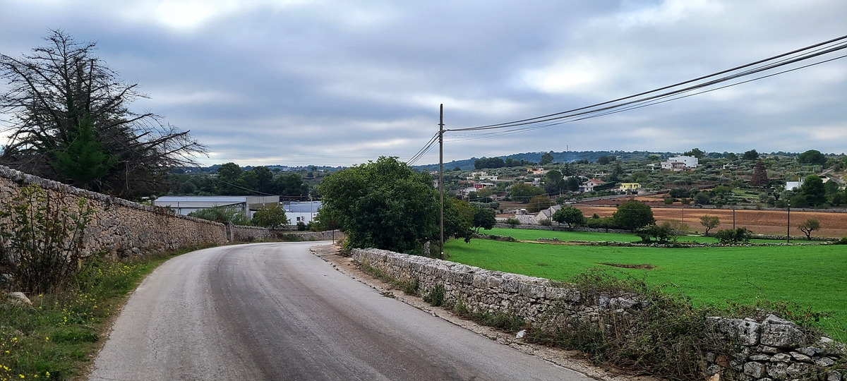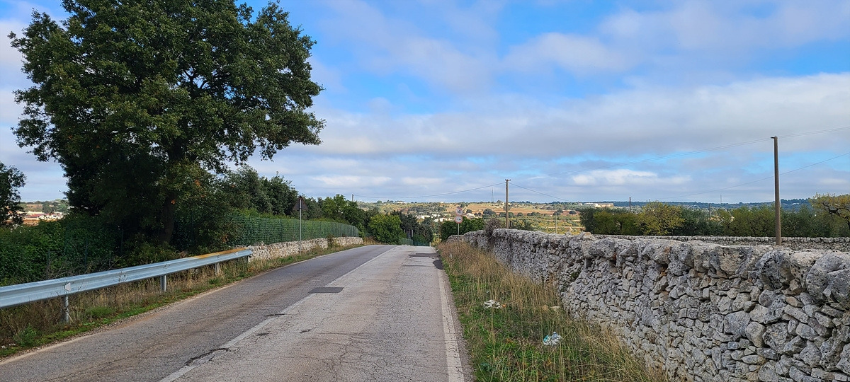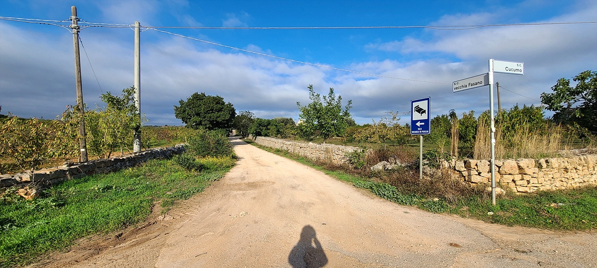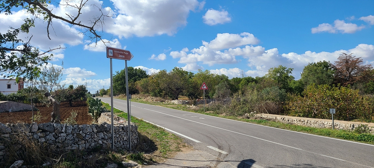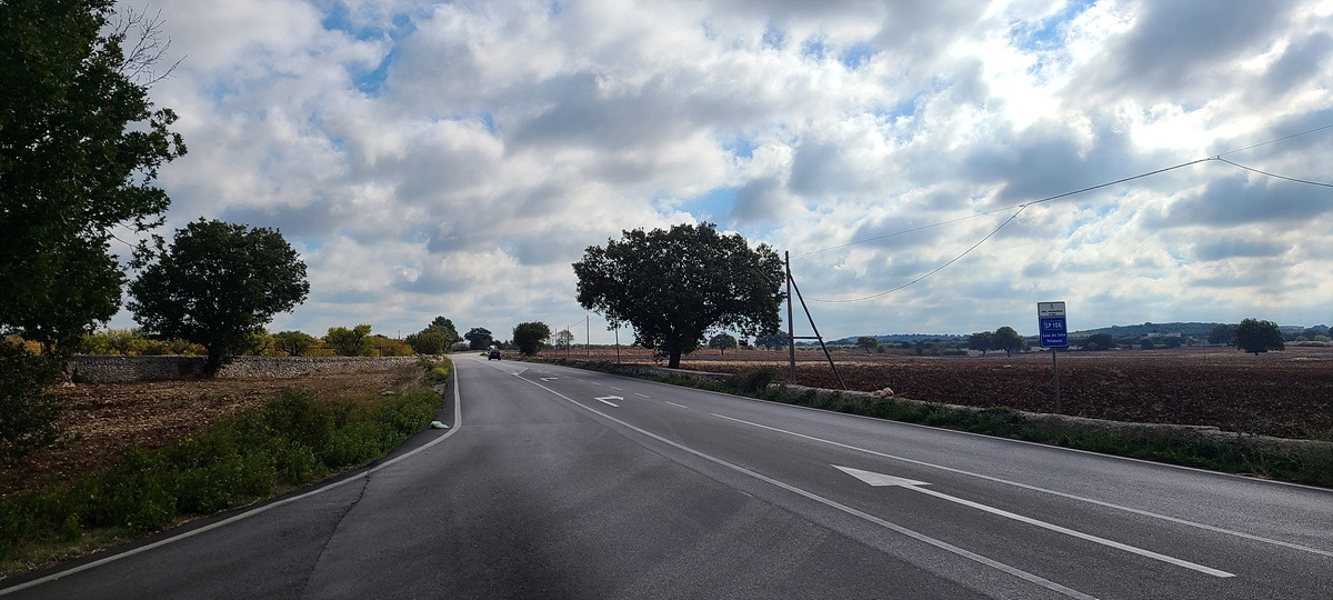 상콤하게 샛길로 시작했더니 업다운이 심해서 자켓을 곧 벗었다. 그러다가 구글에서 안내한 자전거 도로로 갔는데 입구에 자전거 경로 표지판이 있는 비포장이 나왔다. 그냥 SS 도로에서 1km가량 달리다가 다음 샛길에서 다시 빠져나갔다. 푸티냐노(Putignano)부터는 주요 SP 도로를 따라갔는데 차가 엄청 많은 건 아니지만 고속으로 쌩쌩 달리는 것이 마음에 안 들었다.