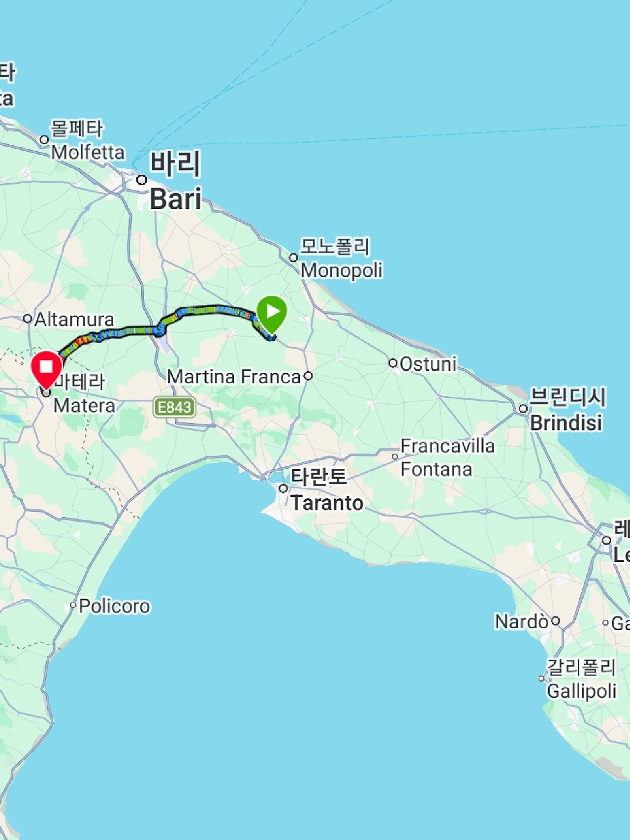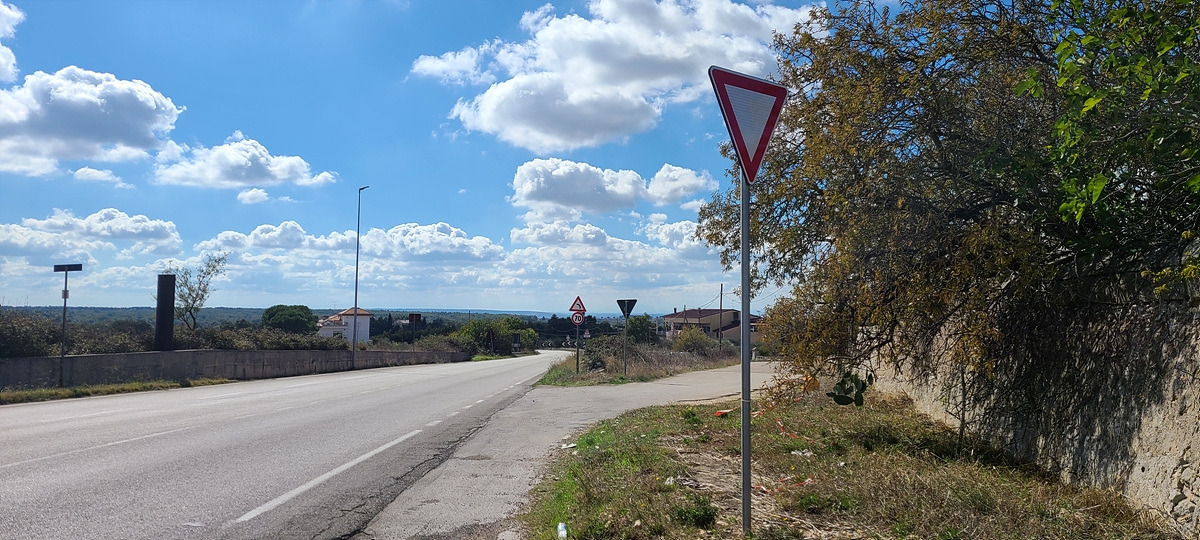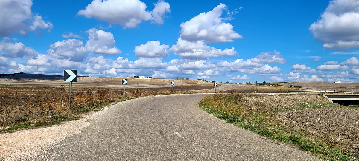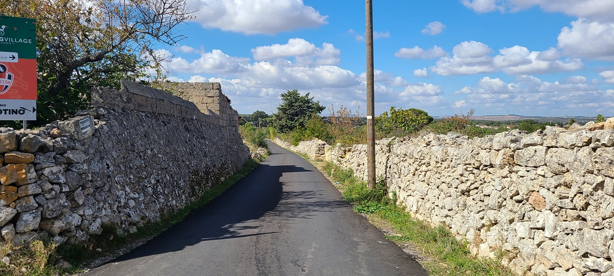 상콤하게 샛길로 시작했더니 업다운이 심해서 자켓을 곧 벗었다. 그러다가 구글에서 안내한 자전거 도로로 갔는데 입구에 자전거 경로 표지판이 있는 비포장이 나왔다. 그냥 SS 도로에서 1km가량 달리다가 다음 샛길에서 다시 빠져나갔다. 푸티냐노(Putignano)부터는 주요 SP 도로를 따라갔는데 차가 엄청 많은 건 아니지만 고속으로 쌩쌩 달리는 것이 마음에 안 들었다.