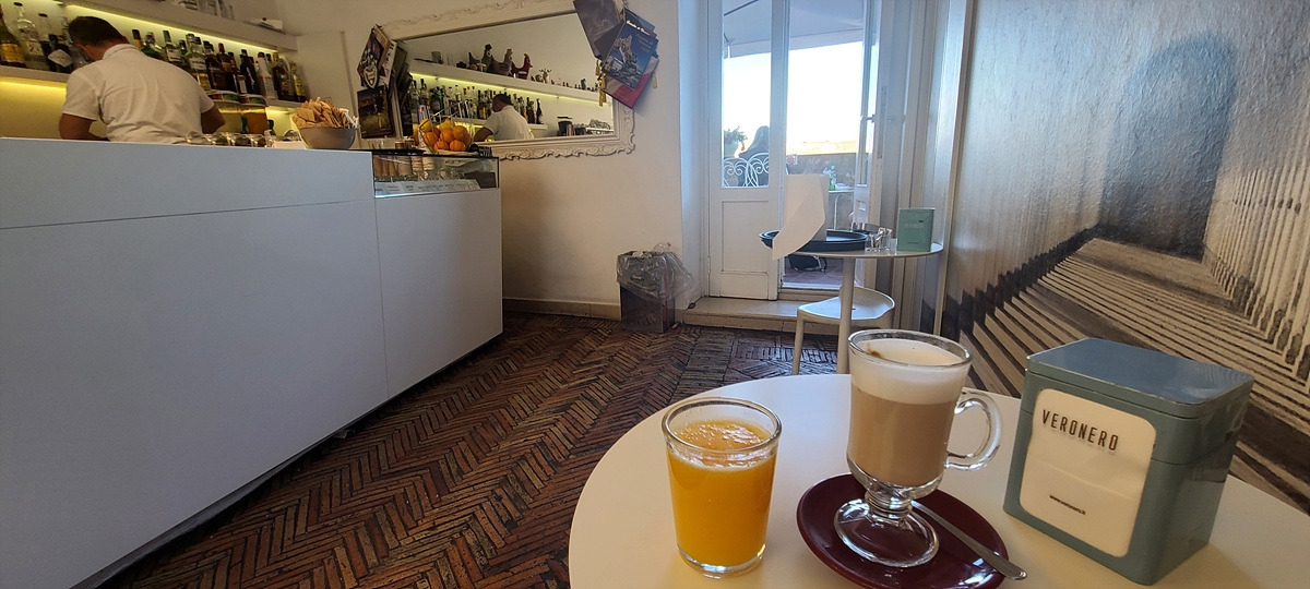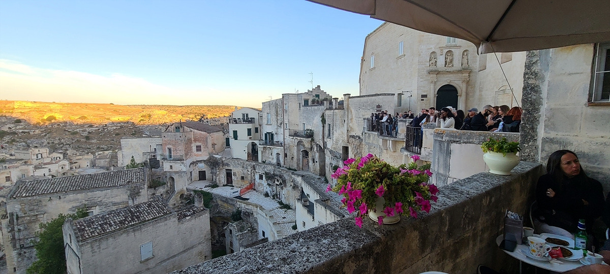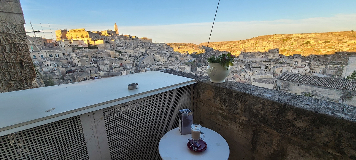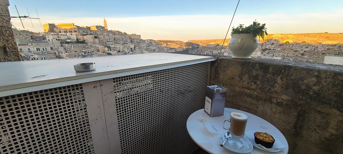 나와서 길거리를 배회하다가 커피를 마시지 못한 것이 아쉬워서 끝내 다른 카페를 들어갔다. 라떼마끼야또와 오렌지 착즙 주스를 주문하고 앉았는데, 왠 이상한 곳에서 사람들이 나온다. 알 수 없는 문을 통과하니 마테라 구시가지 전경이 보이는 작은 테라스에 테이블이 딱 두 개 있는데, 거기서 한 무리가 나온 것이었다. 치우지도 않은 빈자리에 가서 얼른 앉았다. 아까갔던 카페에서 커피가 안 나온 것이 이런 행운으로 다가올 줄이야..