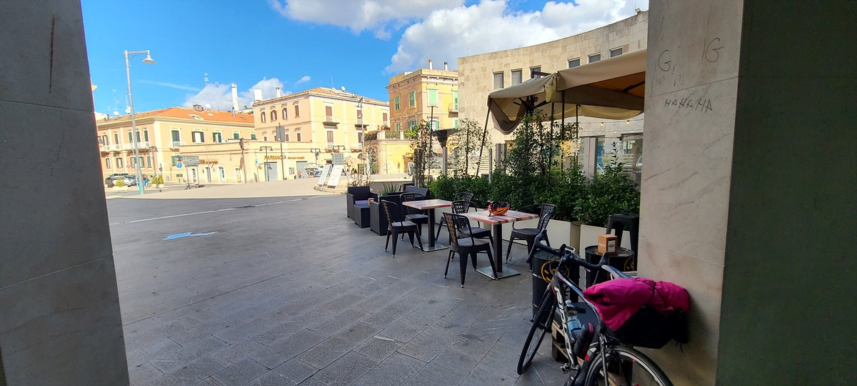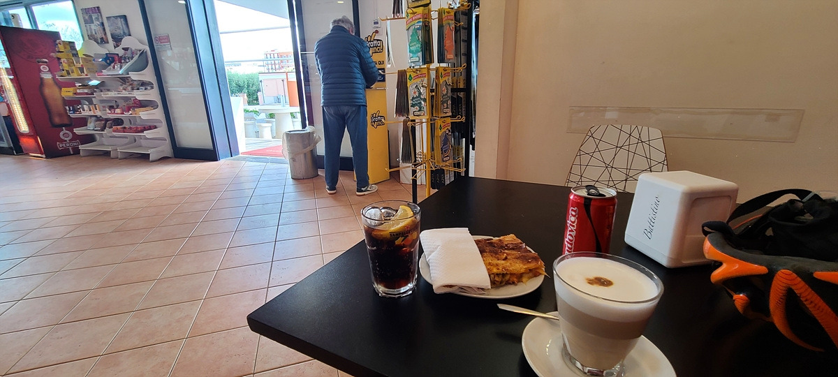 약 일주일 만에 지오이야(Gioia del Colle)에 돌아왔다. 시내는 들어가지 않고 둘러서 도시를 지나가려는데 철도를 건너는 도로가 공사 중이었다. 조금 더 돌아서 사람과 자전거가 갈 수 있는 굴다리를 찾아 건넜다. 그리고 도로 주유소에 딸린 카페에 들어가서 라떼마끼야또, 코카제로와 손바닥만 한 피자빵 같은 걸 먹었는데, 빵이 두텁지 않고 패스츄리 같은 느낌이라 맛나게 다 먹었다.