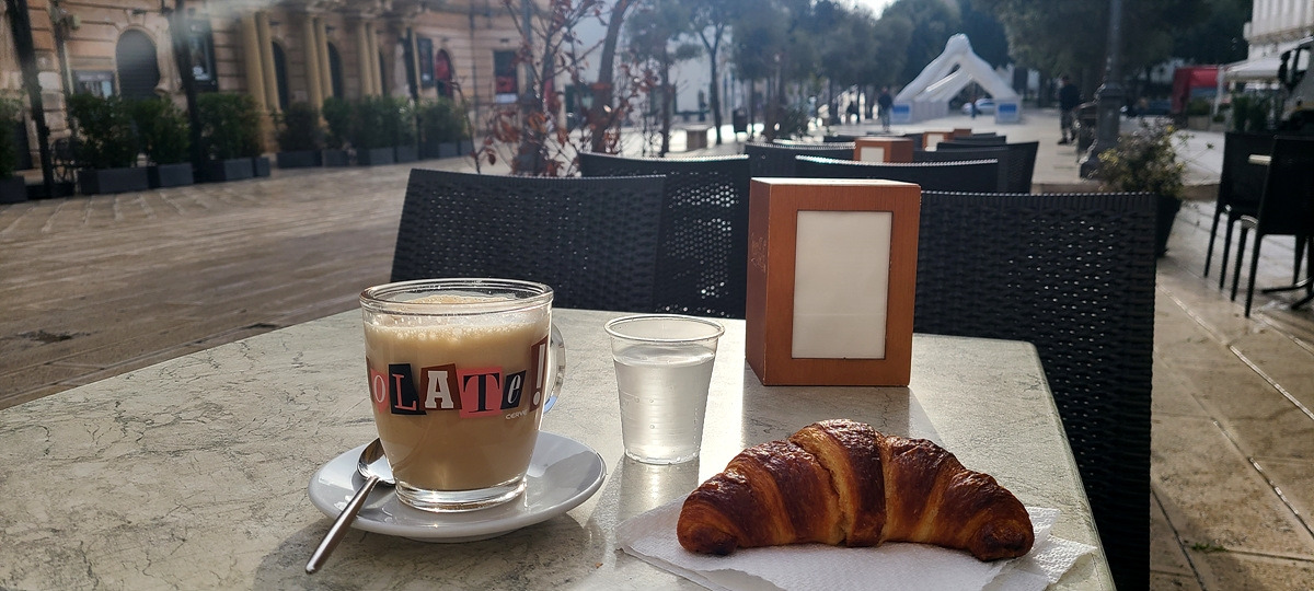 가방을 자전거에 동여매고 광장의 카페에 가서 라떼마끼야또와 크로아상 두 개를 먹었다. 6유로나 나오다니, 관광지 물가는 여윽시 비싸다.
