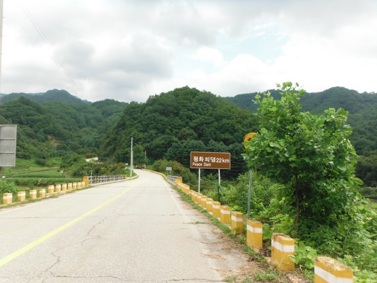 평화의 댐으로 가는 해산령의 입구입니다. 이정표도 있지요. 평화의 댐, 영어로는 피스 댐....