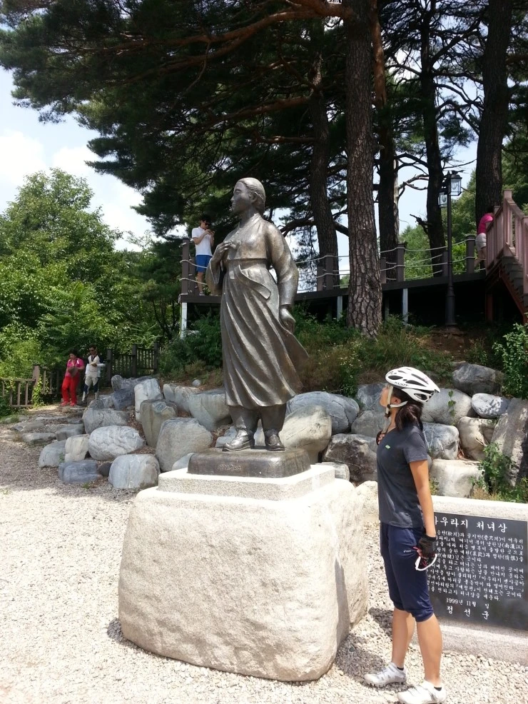 징검다리를 건너가면 아우라지 처녀상이 있습니다. 치마를 날리는 소양강 처녀상보다 소박하네요.