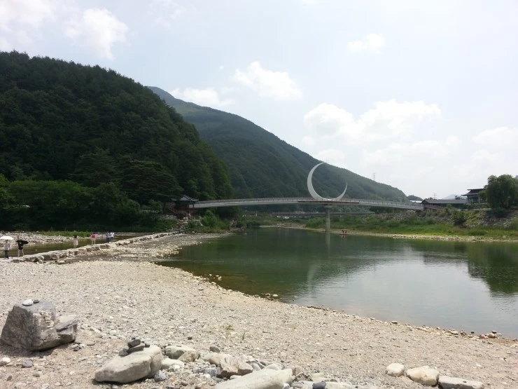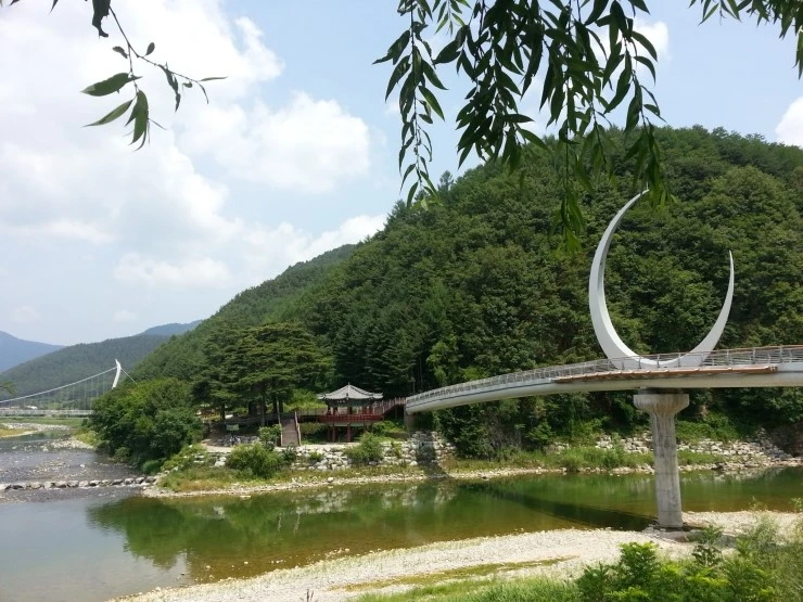 골지천을 넘어가는 반달 모양의 조형이 있던 또 다른 다리도 건넙니다. 바로 앞의 정자는 아까 징검다리 건너에 있던 여송정입니다.