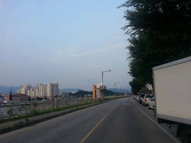 새벽시장에서 간식으로 먹을 천도복숭아도 좀 사다 뒷짐에 넣고 대관령 방향으로 남대천 뚝방 차도로 슬슬 올라갑니다.