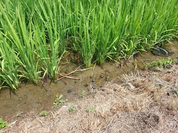 논에 우렁이와 개구리들이 보이네요. 우렁이 농법으로 농사를 짓나 봅니다.