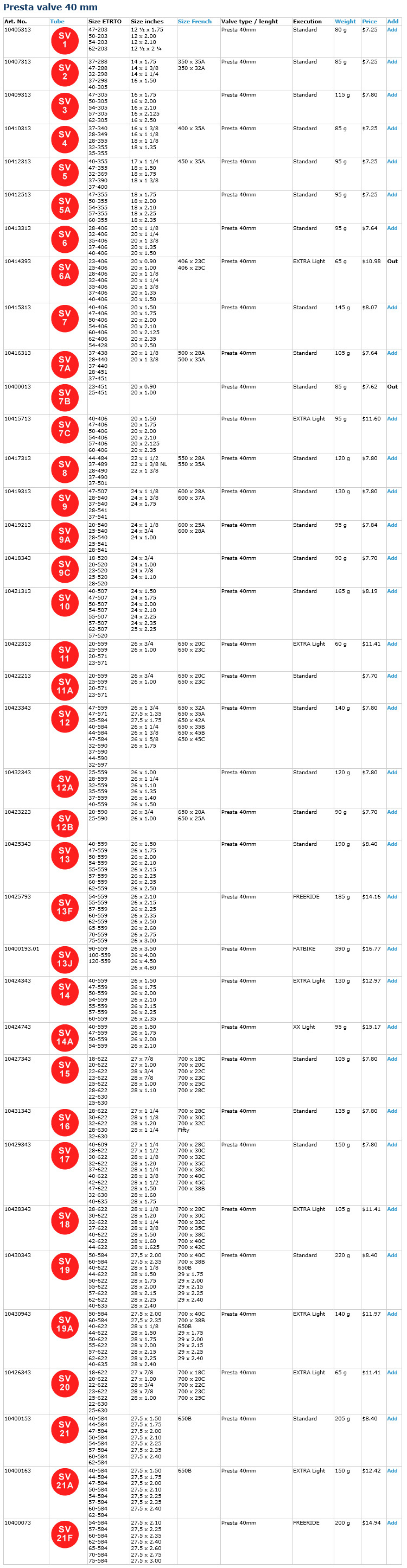 너무도 다양한 튜브 규격 중에서 자기 자전거에 알맞은 튜브를 정확히 골라야 하기 때문이다. 아래 표는 자전거용의 튜브와 타이어를 생산하는 슈발베(Schwalbe)사의 튜브 규격 중에 내가 주로 사용하는 40mm 프레스타 밸브를 사용하는 튜브만 모아놓은 표이다.
