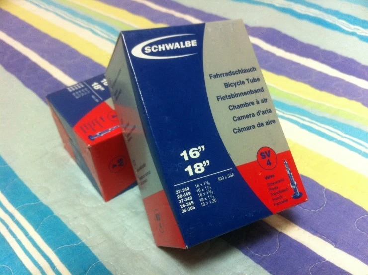 이 튜브의 정체는 같은 18인치이지만 폭이 좁은 고속 주행용 고압 타이어나 349 사이즈 바퀴를 쓰는 미니벨로인 브롬톤에 쓰는 튜브이다.