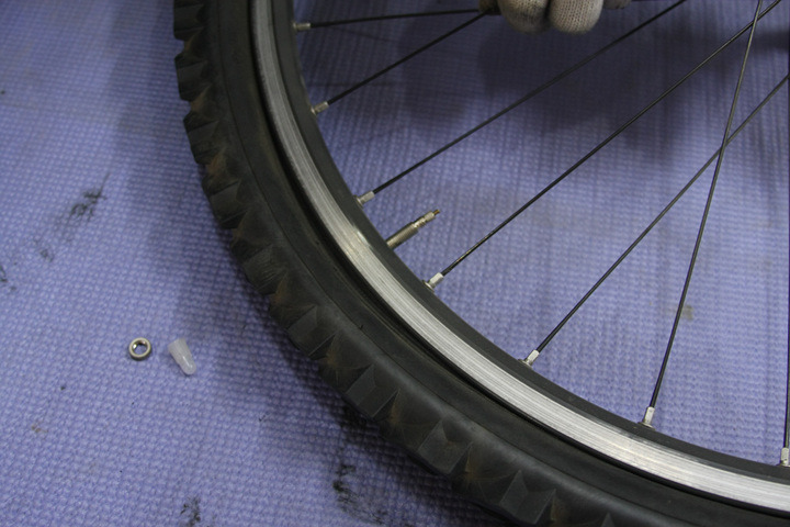 5. 탈거한 뒷바퀴에서 에어밸브를 찾아 밸브캡을 분리하고 남아있는 여분의 공기를 빼낸다.