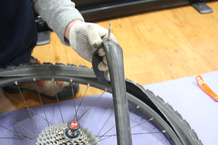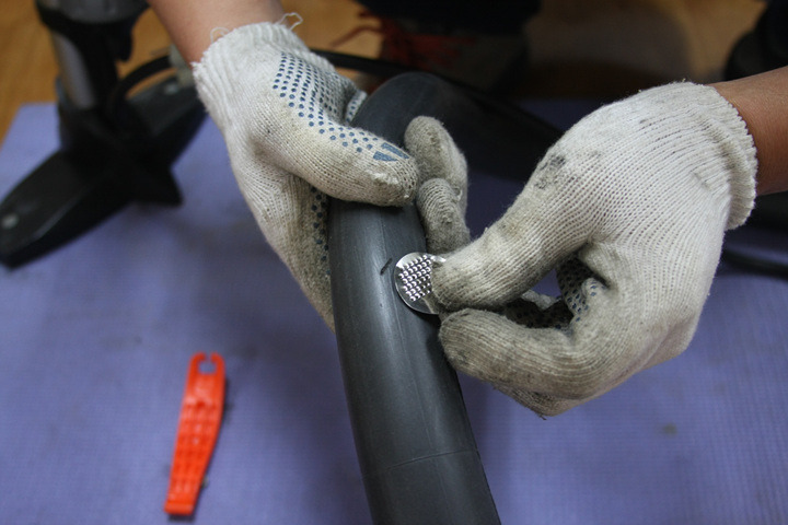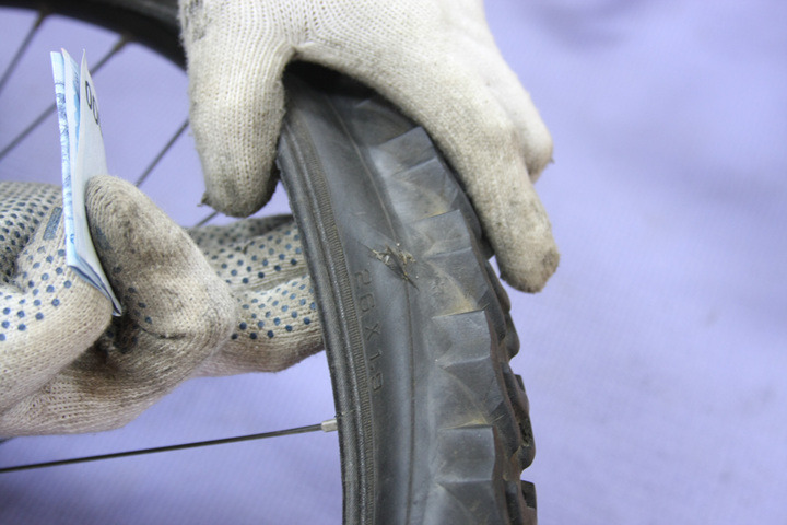 11. 이제 튜브에 패치가 붙어서 마르는 동안 타이어에서 펑크 패치를 붙인 부분을 추적하여 펑크가 발생한 원인을 찾는다. 이것 때문에 아까 8번에서 타이어의 위치를 그대로 두라고 한 것이다. 뾰족한 것이 박혀서 찔렸다면 타이어에 남은 뾰족한 물체를 제거한다. 날카로운 물체에 찔릴 수 있으니 장갑을 끼고 조심해서 작업한다. 뱀에 물린 듯한 씹힌 자국 (스네이크 바이트)이 있다면 공기압이 부족해서 바퀴가 타이어를 씹은 경우이다.