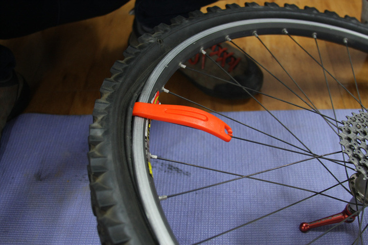 7. 타이어 주걱 하나를 타이어 비드에 걸고 뒷부분을 스포크에 끼워주고 다른 타이어 주걱을 벌어진 틈에 끼워서 바퀴를 따라서 밀어내듯이 타이어를 분리합니다.