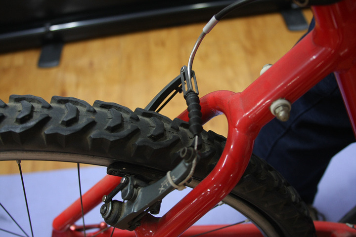 2. MTB용 림 브레이크는 바퀴가 빠질 수 있도록 바나나관을 브레이크에서 분리해야 한다. 유압 브레이크는 이 과정이 없다.