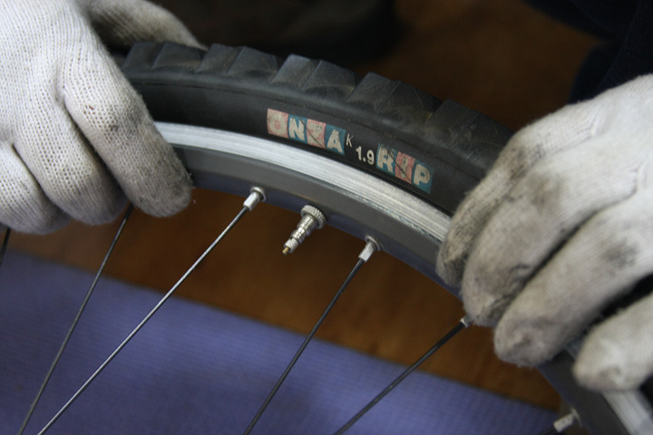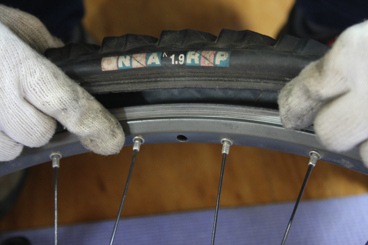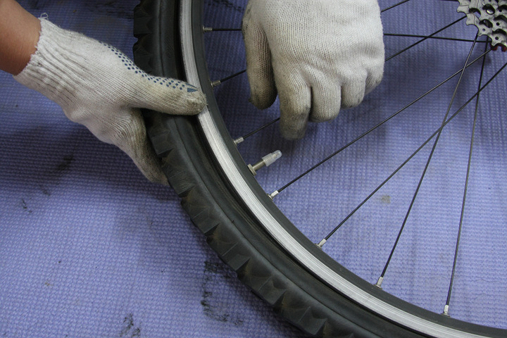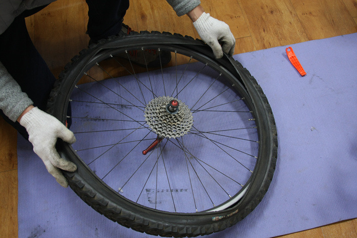 13. 타이어를 튜브를 씹지 않도록 조심해서 끼우고 다시 한 번 정돈합니다. 빡빡해서 잘 들어가지 않을 경우 타이어 주걱을 사용하면 된다.