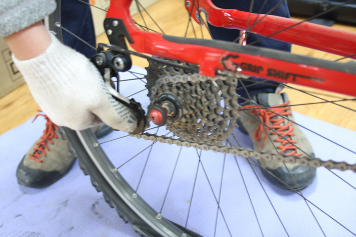 4. 뒷바퀴를 빼기 힘든 것은 뒷 변속기와 체인 때문이다. 뒷 변속기의 본체 부분을 살짝 누르면 공간이 생기면서 뒷바퀴가 쉽게 빠지게 된다. 이때 체인이 딸려올 수 있는데 살짝 빼내면 된다.