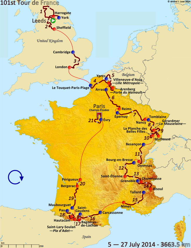 영국의 리즈에서 출발하여 시계 방향으로 돌며 총 21개의 스테이지로 구성되었습니다.