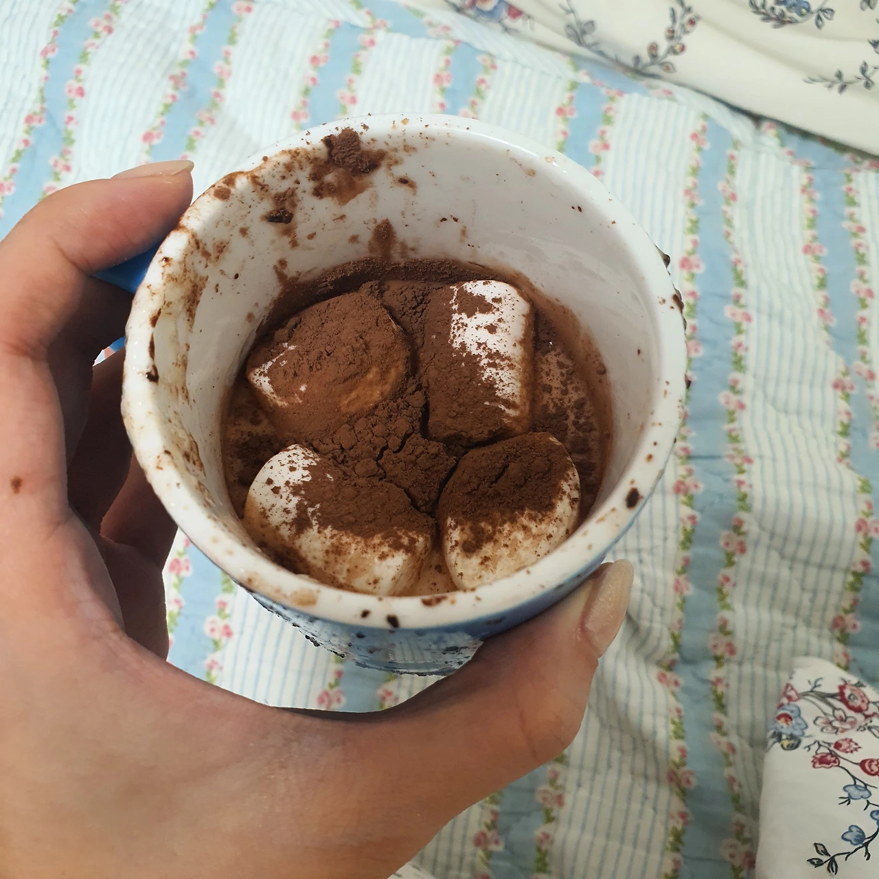 우유에 달달함을 추가하기 위해 마시멜로우를 넣고 코코아 파우더를 뿌렸다.