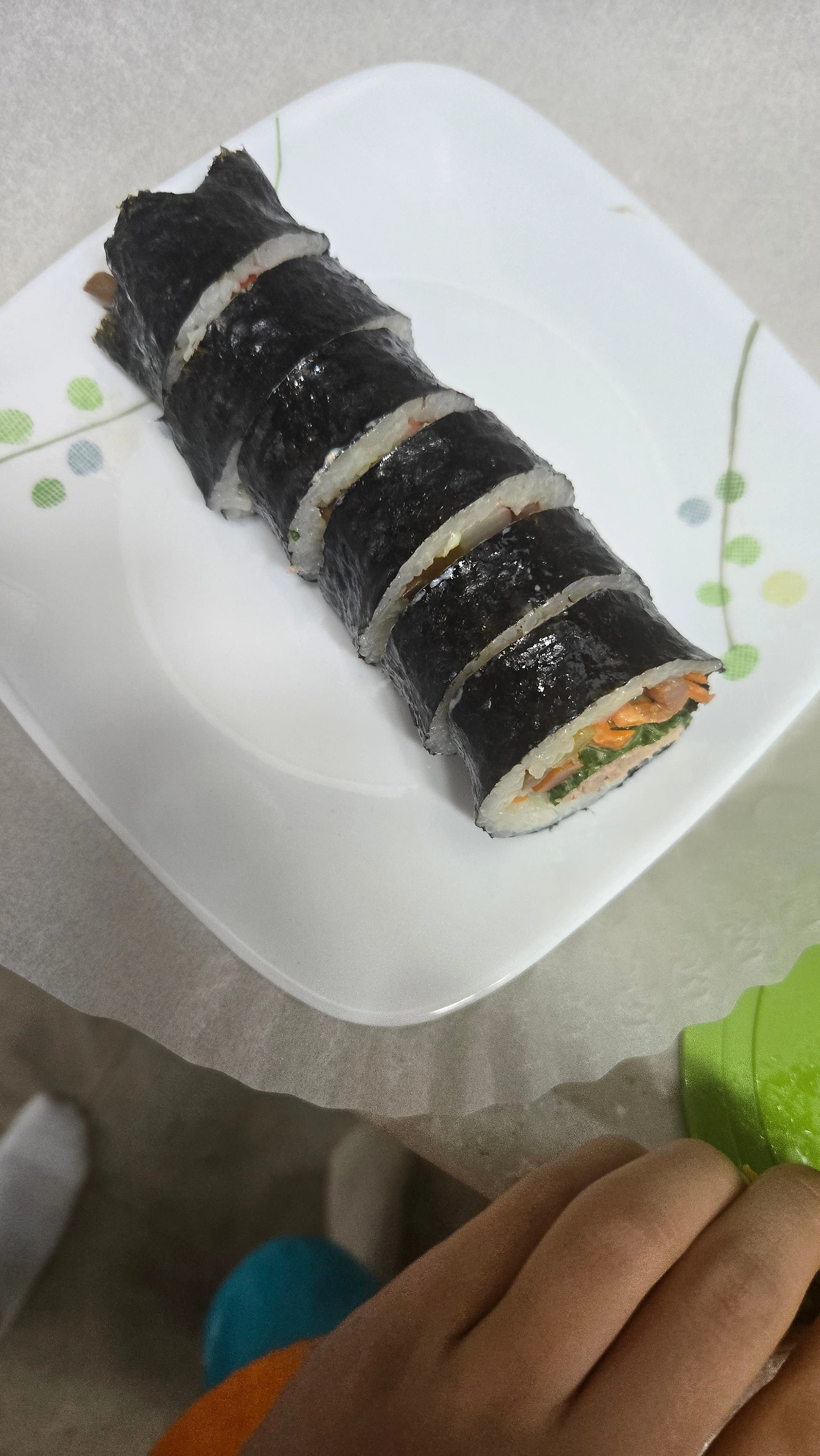 왼손으로 김밥을 안정적으로 잡을 수 없다보니 써는게 문제였다. 이번에는 아들의 도움을 받아 예쁘게 김밥을 썰어봤고, 김밥 비주얼도 나름 성공적이다.