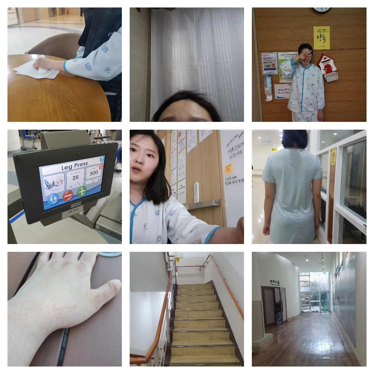 나는 남편과 엄마의 굴레를 벗어나 은둔의 공간을 찾기 위해 병원 여기저기를 다녔다. 휠체어를 타고 다니니 생각보다 기동력이 좋았다. 한발, 한팔로만 휠체어를 움직여야 되기 때문에 운전(?)하기 쉽지 않다. 그래서 휠체어는 후진으로 가는게 짱이다..^^ 대신 뒤를 잘보고 운전해야 한다는 주의사항이 있다. 휠체어를 후진해서 다니며 찾은 나의 은둔의 공간은 계단통로였다. 대부분 병원의 계단은 비상통로로 쓰여서 인적이 드물다. 간 김에 계단오르내리기 운동도 하고 그랬다. 하지만, 낙상의 위험이 크고, 비상시에 도움을 요청하기도 힘들어서 웬만하면 환자 혼자 가지 않으셨으면 한다. 무엇보다 냉,난방이 안 되는 공간이라 별로다.. 계단에서 혼자만의 시간을 많이 보냈다. 앞으로 이런 계단은 어떻게 다니나 하는 걱정부터 하루일과를 정리해보기도 하고, 혼자 울기도 하고 계단통로에서 많은 걸 했다. 또는 치료실. 내가 있던 병원 중 한 곳은 일과 후 치료실을 개방하여 환자들이 자율운동을 할 수 있게 했는데 최대한 사람이 없는, 혼자 있을 수 있는 치료실을 찾아 그곳에서 혼자 운동을 했다. 운동하는 모습을 찍기도 하고 생각나는 사람들한테 전화도 하고, 남편 눈치 안보고 혼자 있는 공간이 너무나 큰 위안이 되었다. 혹은, 야외공간. 엄마와 보바스기념병원에 있을 때는 1층 야외정원에 많이 갔다. 걷는 연습하러도 가고, 주말에는 야외테이블에서 노래도 듣고, 책도 읽고, 병실친구들과 산책도 가고 그랬다. 어느 병원을 가든 나만의 공간을 찾아두고 힘들 때마다 그곳에서 혼자만의 시간을 가졌다. 단, 안전이 보장되는 곳이어야 한다. 환자인 만큼 돌발 상황에 대비할 수 있는 공간이어야 한다. 환자가 혼자만의 시간을 가질 때, 보호자도 그제야 혼자만의 시간을 가질 수 있다. 환자나 보호자나 각자의 시간과 공간에서 은둔해야 스트레스를 관리하기 쉬워진다. 그럼 은둔의 공간에서 무엇을 하냐고. 그래봤자 병원인 곳에서?