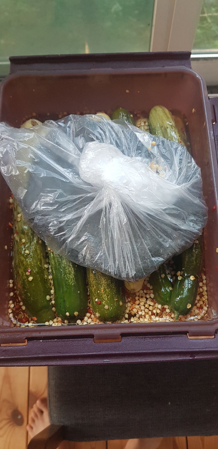납작한 돌을 비닐에 싸서 꼭 눌러야 해. 오이가 물속에 다 잠기도록. 위로 올라오면 무르고 상하니까 누름돌로 눌러주는 것이 제일 중요. 일주일 후부터 먹어도 되더라. 누름돌은 할머니가 쓰던 것을 두고 쓰는데, 없으면 그릇을 뒤집어서 뚜껑으로 누르거나, 누름 뚜껑이 있는 김치통도 있더라. 강가에 놀러 가면 납작하고 묵직한 돌 하나 구해서 누름돌로 쓰면 좋지. 할머니가 그러셨거든.