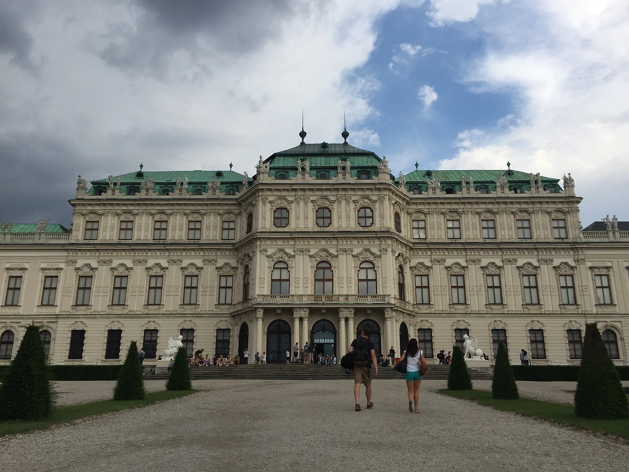 기분 좋게 상궁 관람을 끝내고 정원을 산책중이었는 데, 쥐도 새도 모르게 먹구름이 몰려왔다. 사진 찍느라 정신 팔려 먹구름이 오는 것도 몰랐다. 궁 앞에서 포즈을 취하는 바로 그 때 내 인생에서 가장 크고 격렬하게 소나기가 찾아왔다. 마치 오스트리아 빈에 처음 온 날 격하게 환영하는 것처럼. 결국 격한 환대에 벨베데레 상궁으로 뛰어가 지붕 밑에서 환영인사를 멈추기를 기다릴 수 밖에 없었다. 우산이 있는 다른 외국인들도 마찬가지였다. 우산을 쓰나 마나 비 맞는 양이 비슷할 정도의 비바람이었다.