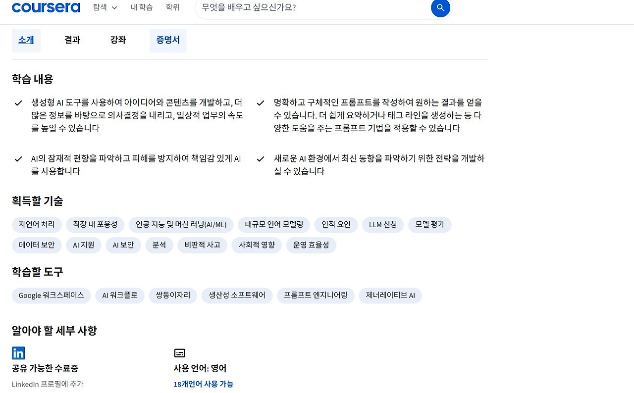 수료증 확인: 모든 학습 완료 후 'Accomplishments' 메뉴에서 수료증을 확인하고 PDF로 저장하세요.