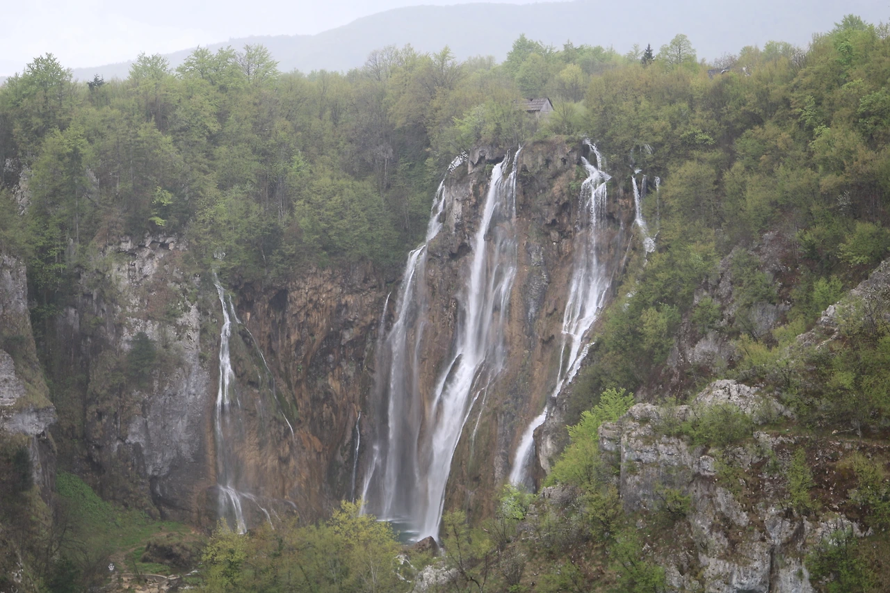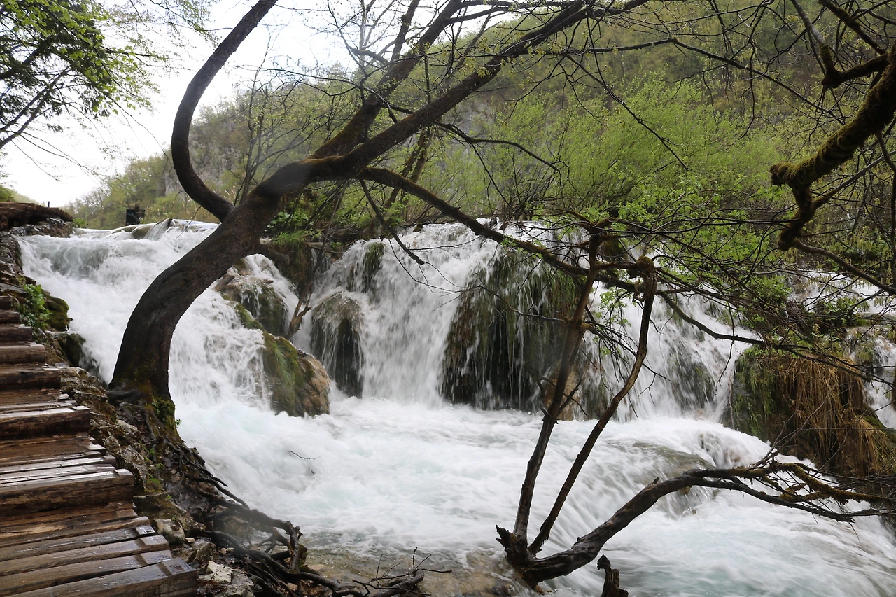 그런데 난 또 하이라이트에서 발목이 잡히고야 말았다. 플리트비체 국립공원의 가장 큰 폭포이자 가장 유명한 포토스팟이기도 한 78m 높이의 벨리키 폭포(VELIKI SLAP)로 가는 길이 비가 너무 많이 내리는 탓에 구간 통제가 되어있다. 잘 모르는 내가 언뜻 보아도 지금 상태로 계속 비가 내린다면 트레킹을 위해 나무로 만들어놓은 길도 곧 덮여 아예 길이 없어질 것만 같았다. 꽃보다 누나에서 출연진들이 엄청나게 거대한 폭포를 배경 삼아 벤치에 앉아 멋진 사진을 찍었던 바로 그 장소가 바로 벨리키 폭포였고, 나 역시도 폭포 아래에 앉아 멋지게 독사진을 찍겠노라 다짐을 하고 이곳에 왔는데... 역시, 여행이란 인생처럼 뜻대로 다 되지 않는다는 것을 이렇게 또 실감한다. 너무나 아쉬운 마음에 한참을 그렇게 내리는 비를 맞으며 통제구간 앞에서 서성거렸다. 이 나무만 없다면, 이길로 곧장 조금만 더 걸어간다면 꿈에 그리던 벨리키 폭포를 마주할 수 있을 텐데... 정말 아쉬웠다. 하지만, 빗줄기는 점점 더 굵어져 왔고 행여나 미련한 미련 때문에 감기라도 걸렸다가는 아직 많이 남아있는 나머지 여행까지 모조리 망쳐버릴 수도 있다는 생각을 했다. 벨리키 폭포를 가까이에서 볼 수 없는 아쉬움보다 그쪽이 훨씬 더 아찔하기에, 이건 내가 고집을 피운다고 해결되는 상황이 아님을 인지하기 시작했고, 곧 이성적인 판단을 내릴 수 있었다. 그렇게 난 어쩔 수 없음을 받아들이고 터벅터벅 무거운 발걸음을 옮긴다.