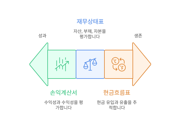이러한 이유로 손익계산서 한 장만으로 회사의 상태를 판단하는 것은 매우 위험합니다. 기업의 진짜 사정을 파악하기 위해서는 손익계산서, 재무상태표, 그리고 현금흐름표 세 가지를 반드시 함께 봐야만 '흑자 도산'의 미스터리가 풀립니다. 손익계산서가 '얼마나 벌었는지(성과)'를 보여준다면, 현금흐름표는 '그래서 실제 돈은 어디에 있는지(생존)'를, 재무상태표는 '그 결과 회사의 체력은 어떠한지(건강 상태)'를 알려줍니다. 이 세 가지 관점이 합쳐져야 비로소 입체적인 모습이 드러납니다.