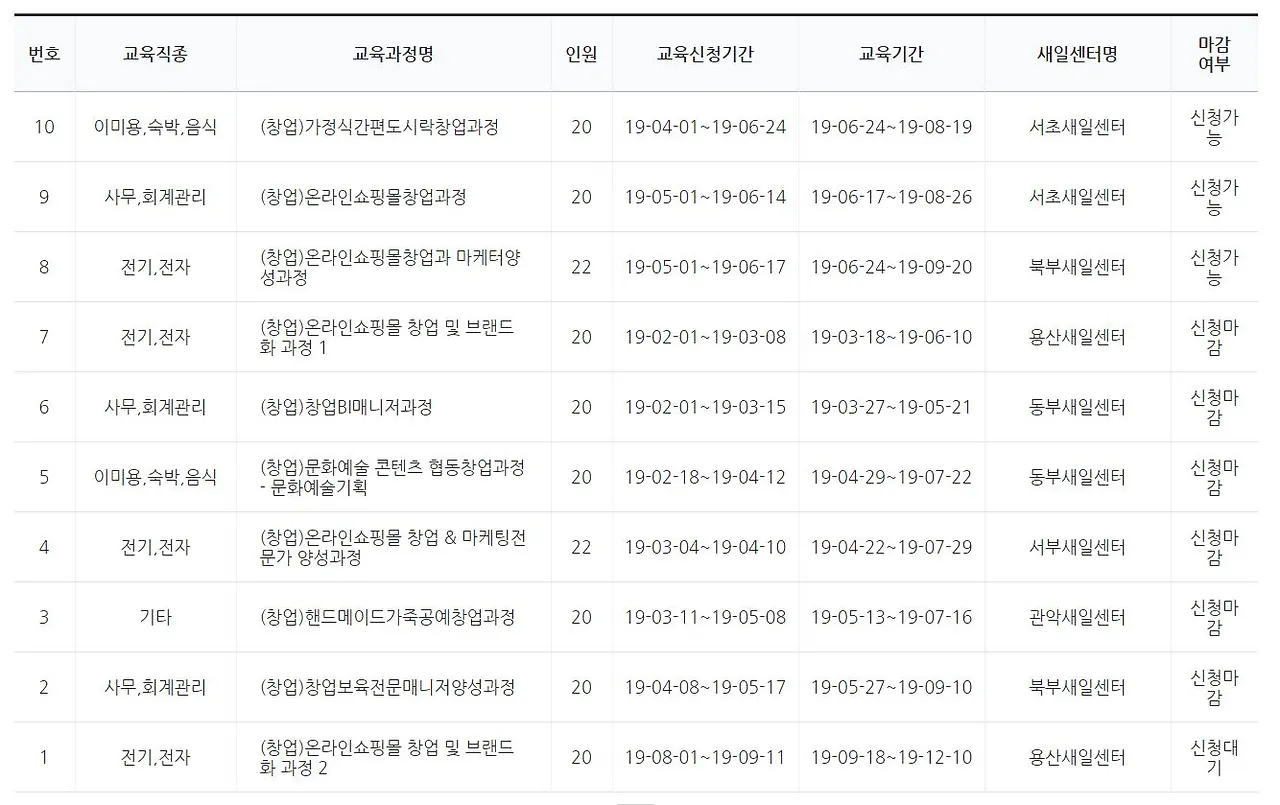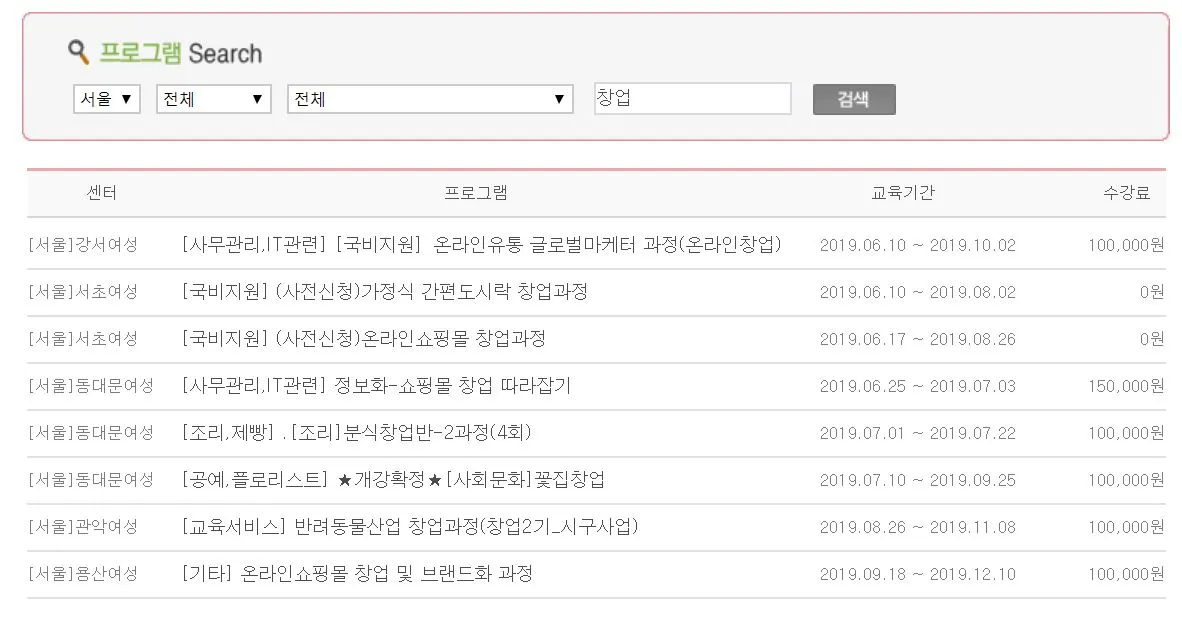 여성인력개발센터 프로그램 중 ‘창업’ 검색한 내용 (서울 지역) 거의 국비 지원 교육. 소정의 교육비를 내더라도 교육 과정을 수료하거나 취업이 되면 거의 환불이 된다.
