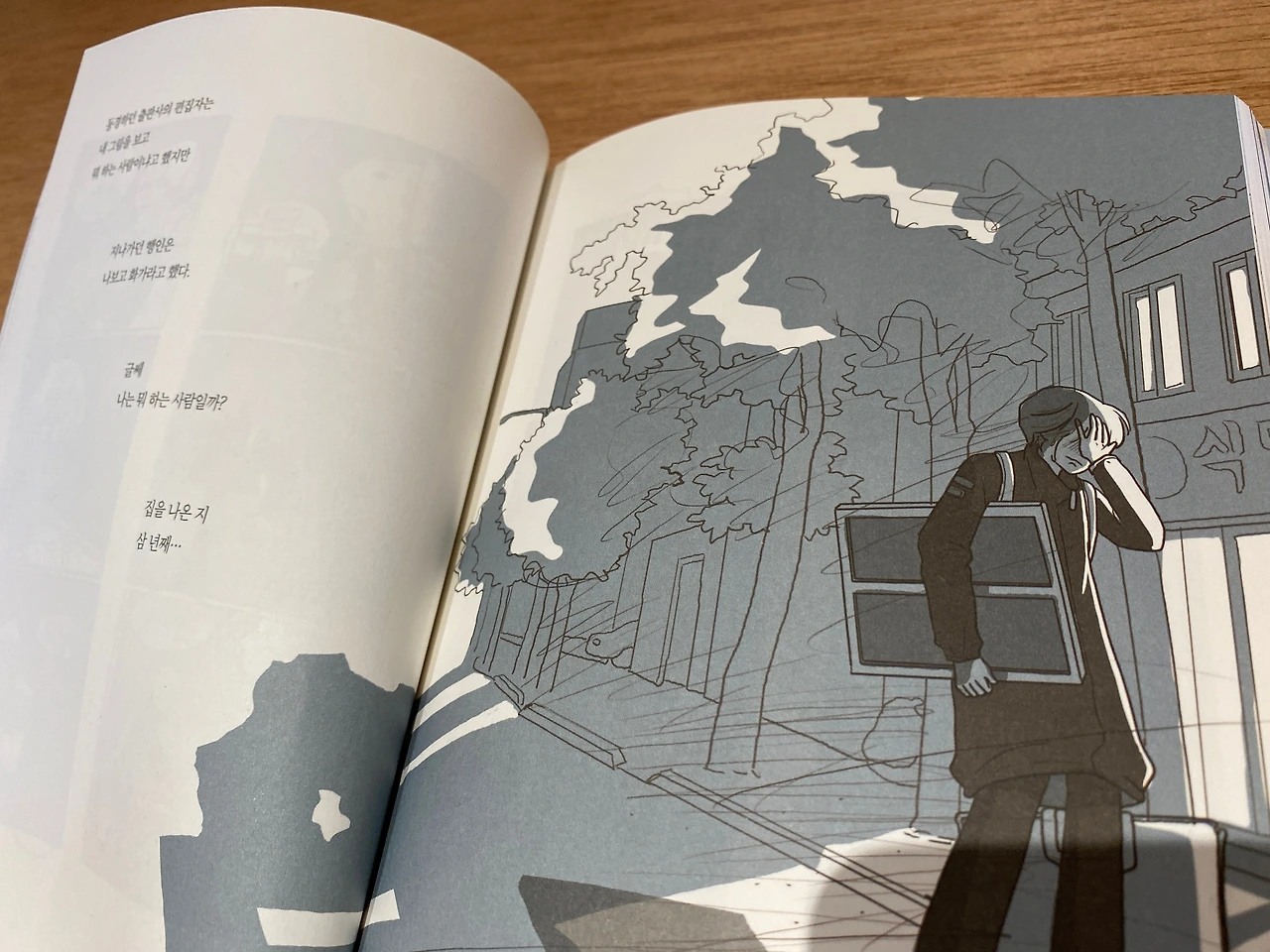 그리고 이 연출에 두 주인공들의 서사와 ‘여정’이 더해지며 이 작품은 더욱 깊어져간다. ‘송이’는 만화를, ‘순이’는 일러스트를 그리는 창작자이다. 둘은 같은 미술대학을 졸업해, 창작자의 삶을 살아가려 하지만 이는 결코 만만치 않은 일이다. 일할 수 있는 틀은 너무나도 제한적이며, 그 틀은 자신들말고도 무수한 이들이 덤벼드는 곳이며, 심지어는 그 틀을 꾸리는 이들이 이 심리를 이용하기까지 한다. 하지만 그 이상으로 문제는, 작품을 그리기 위한 기본적인 작업을 위한, 동시에 일상을 유지하기 위한 공간이 없다는 것이다. 그리고 그 공간은 그저 물리적인 의미를 넘어, 내가 심리적으로 안착할 수 있는 공간에 대한 소구기도 하다.