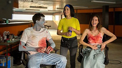이를 의식했던지 이번 프랑스 리메이크는 최대한 원작의 구도에서 크게 달라지지 않은 길을 갑니다. 1부에서는 원컷의 좀비 장르 극중극을- 2부에서는 카메라의 뒤를 보여주는 연출도, 1부와 2부의 전개되는 상황도, 심지어는 1-2부의 중요한 연출이나 반전 포인트들도 일본 원작과 똑 닮았습니다. 따라서 일본 원작을 이미 보신 분들께 프랑스판의 전개는 너무나도 예측이 갈지도 모르겠어요. 원작의 배우들과 장소들을 프랑스로 옮기면 바로 이 프랑스판이 되는 수준입니다.
