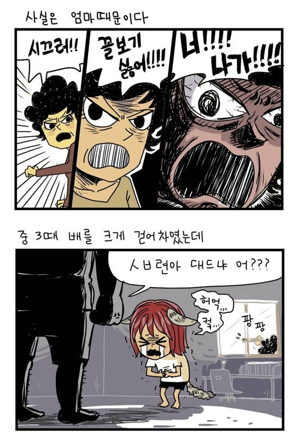 어렸을 때부터 무자비한 폭력에 무방비하게 노출된 작가는 처음에는 남몰래 울면서 자신이 겪는 폭력에 고통스러워한다. 그렇게 조금씩 가족들에 대한 증오와 편견을 갖게 되지만 동시에 그녀는 같은 여자이면서 자신에게 폭력을 행사하는 엄마에게 인정받고 싶어 하는 욕망을 가지기도 했다. 그러나 그 욕망은 결국 이뤄질 수 없는 꿈에 불과하다. 결혼한 이후로부터 아빠의 폭력에 시달린 엄마는 말 그대로 '매 맞는 여자'의 심리처럼 아빠의 폭력에 고통을 받으면서도 자신과 비슷한 상황에 처해있는 딸을 이해하지 못한다. 인정을 받지도 못하고, 그렇다고 폭력에서 빠져 나오지도 못하는 상황에서 작가는 어린 시절 조금씩 자존감을 잃고 결국 학교에서 '은따'를 당하는 상황에까지 놓이고 말았다.