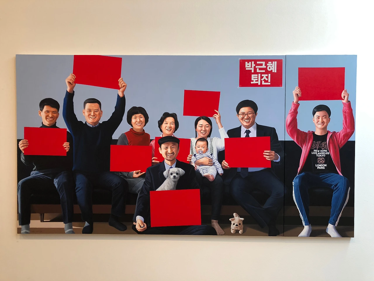 물론 그의 작업에서는 여전히 분노와 투쟁이 담겨 있다. 2016-2017년의 박근혜 퇴진 촛불을 소재로 삼은 <광장> 시리즈는 당시 배포되았던 주장 피켓과 광장에 나온 사람들, 그리고 ‘촛불’이라는 이미지를 형상화한다. 그러나 겉으로 보기엔 광대해 보여도, 그 안의 맥락은 이전과 비교하면 무척이나 축소되어 있다. 박근혜를 퇴진하자는 ‘크지만’ 역설적으로 ‘일부의’ 주장만이 강조된채, 연작 역시 그 주장을 그대로 답습하는 이상을 넘지 못한다. 도리어 그가 포착한 이미지는 홍성담의 <더러운 잠>처럼 과거의 ‘정상가족’에 갇혀 있다는 슬픈 현실만 더욱 극대화할 뿐이다.