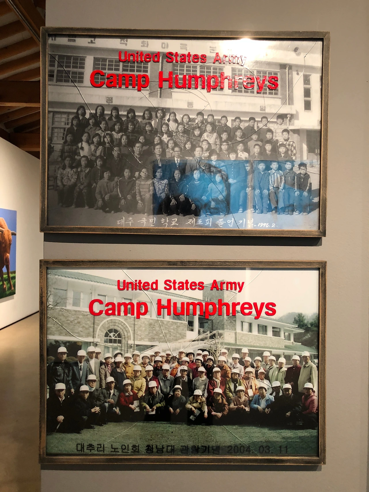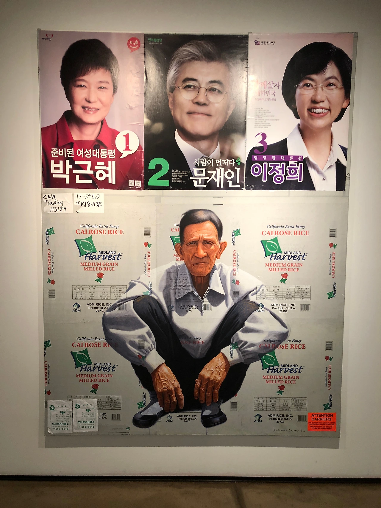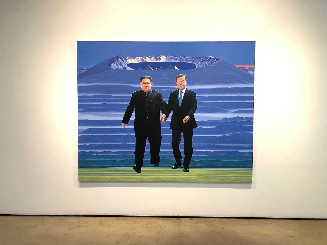 그리고 2018년 연이어 벌어진 남북정상회담을 소재로 한 <봄이 왔다> 연작으로 가면, 가뜩이나 붕괴 직전에 놓인 작품의 흐름은 스스로의 파괴로 다다른다. 이제 이 작품은 당대의 민중미술을 비롯한 현대의 미술이 끊임없이 경계한 ‘(기록) 사진’과 다를바 없는 작업이 된다. 그가 걸었던 삶을 생각하면, 남북이 다시 평화의 길을 걸어가려 하는 시도에 필시 열광했을 것이다. 그러나 그 정념은 너무나도 쉽게 작품에 고스란히 담기며, 역설적으로 작품을 무너뜨리는 것이다. (그나마 이제는 미군기지가 지어진 평택 대추리 마을 사람들의 옛 사진에 미군기지 마크가 새겨진 액자를 씌워놓은 <대추리 사람들 - 캠프 험프리스> 연작이 체면치레를 한다.)