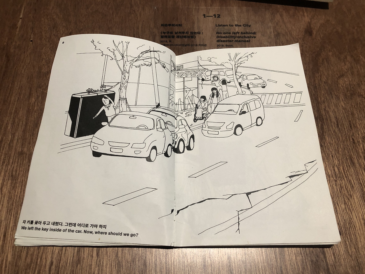 지진 이후 방송에서 지진 시 대피방법을 홍보하는 회수가 늘어났고, 대피소를 파악하는 이들이 늘어났다. 그러나 그 시도는 얼마나 구성원의 층위가 다양하며, 이 중 일부는 평소에도 체념하고 있음을 인식하는가. ‘안전 매뉴얼’ 발간물은 일반적인 도해 형태의 매뉴얼의 외피를 쓰지만, 그 안에는 다양한 특성을 지닌 이의 대피가 어떤 시스템과 공동체 아래서 가능한지를 말한다. 영상을 통해 피해의 상과 경험을, 워크숍을 통해서는 그 경험의 대비를, 그리고 매뉴얼을 통해서는 어떠한 인민적 경험과 학습이 필요한지를 묻는 유기적 분업을 리슨투더시티는 보이고 있다. 올해의 미디어시티비엔날레에서 내세운 ‘좋은 삶’이라는 주제가 시작 전부터 붕괴된 가운데, 리슨투더시티는 그 ‘좋은 삶’이라는 말 자체가 각자마다 층위가 다르게 다가옴을 인식하는 형태로 새로운 작업을 드러낸 것이다.