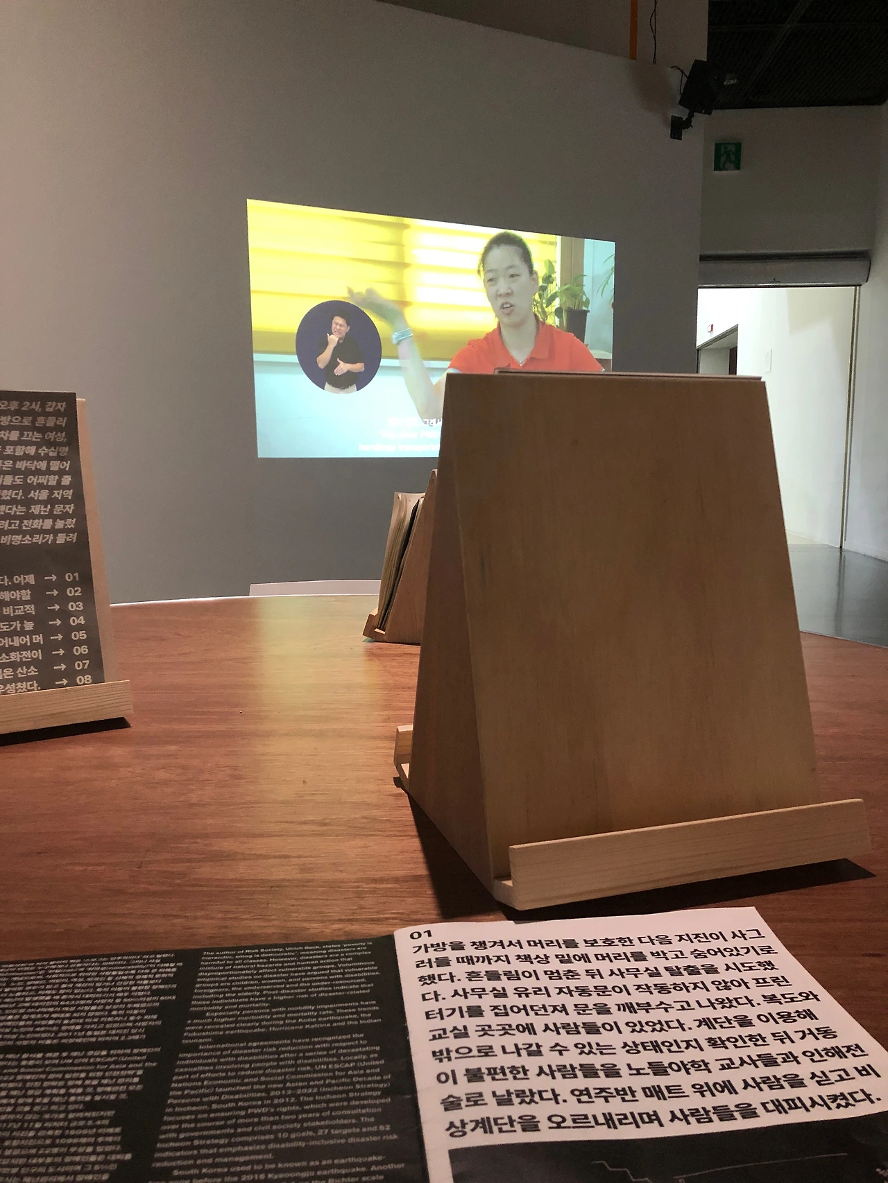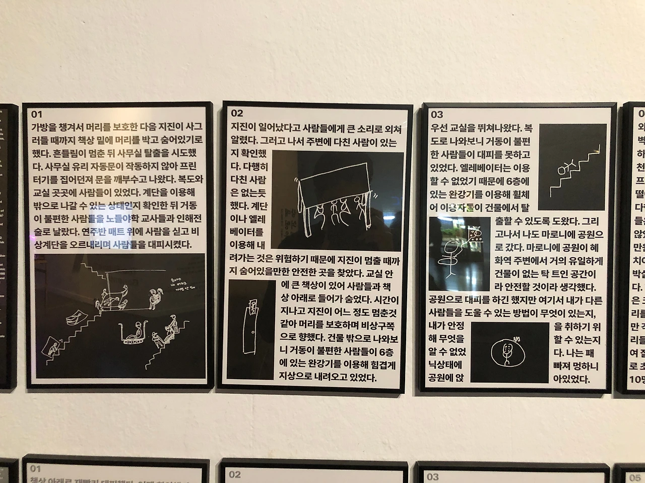 영상이 경험을 말한다면, 출판물은 이 경험을 토대로 두 차례의 사고 실험과 실제로 이 사회에 필요한 사항들을 전달한다. 어느 가상의 시간대, 갑작스레 서소문의 서울시립미술관 건물이- 또는 노란들판장애인야학 건물이 지진 속에 놓인다면 그 안의 구성원들은 무엇을 할 수 있을까. 모두들 지진 속의 무력감, 갑작스레 발생한 재난 속 생존 욕구를 읊지만 공간이 달라지기에 사고 실험의 층위도 달라진다. 미술관 사람들의 사고 실험이 사변적인 경향이 강하게 드러난다면, 장애인 야학의 사고 실험은 철저히 자신들의 대피 방법 서술이 강조된다. 이미 그들은 자신들이 쉽게 움직일 수 없다는 것을 너무나도 잘 알고 있기에, 더욱 안전에 민감하게 반응한다. 미술관 워크숍의 9번 사례가 ‘3층에서 휠체어를 탄 성인 남성’을 발견함을 말하고, 그 안에서 드러날 딜레마를 말함을 생각하는 지점에서 재난은 결코 동등하지 않음을 극명히 드러낸다.