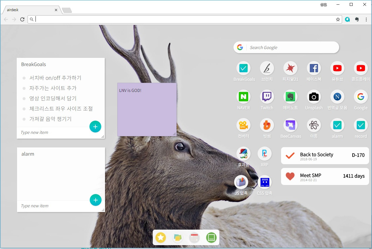다음 개발 목표가 배경화면과 기본적인 박스 스타일의 변경입니다. 배경화면을 선택하는 게 복잡한데 깔끔하게 바꾸고, 기본 박스 스타일도 더 섹시하게 바꾸고자 합니다. 제가 이를 끝낼 즈음 다른 팀원분이 개발한 스크린샷 기능도 추가될 것 같습니다. 이후엔 폴더를 추가해서 아이콘을 깔끔하게 정리하는게 좋을거 같습니다.