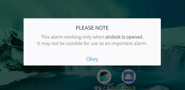 알람이 켜지게 되면 에어데스크가 흐려지고 확인 창이 뜹니다. 알람 사운드는 영원히 반복됩니다.