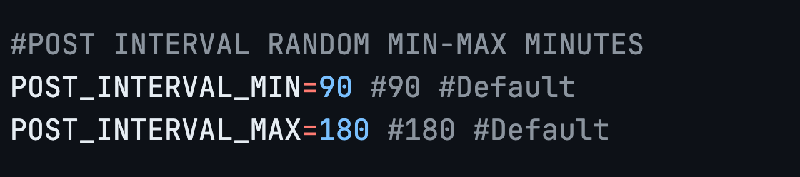 포스팅 인터벌 부분에 최소 최대 값을 원하는 시간(분)으로 입력하면 해당 주기에 맞춰 콘텐츠를 생성합니다.