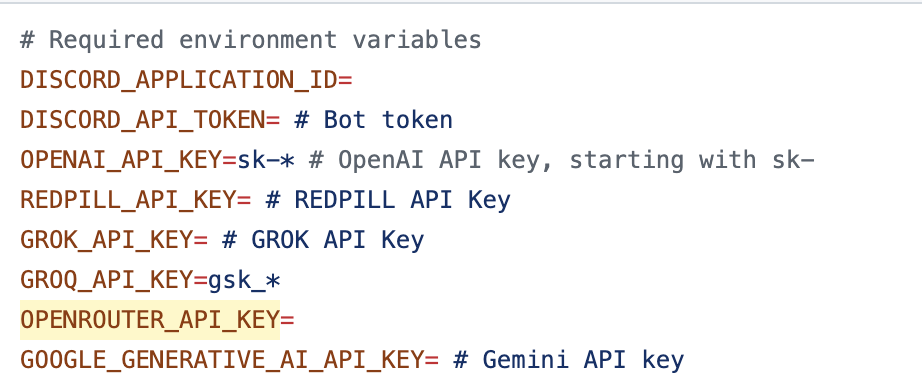 환경 변수 중에 여러분이 사용할 AI 서비스에 대해서는 API 키를 받아와 설정해 주시면 됩니다. 저는 Open router를 사용하고 있으니 환경 변수 중에 OPENROUTER_API_KEY= 이 부분에 제 키를 입력해 사용하고 있습니다. 만약 Open AI를 사용하시면 OPENAI_API_KEY에 값을 넣어주시면 됩니다.