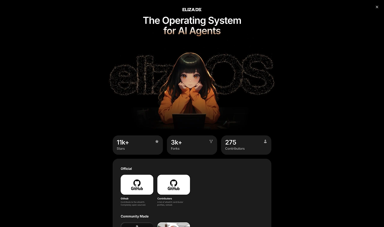 홈페이지에 들어가 elizaOS를 클릭하면 다음과 같은 화면이 나옵니다.
